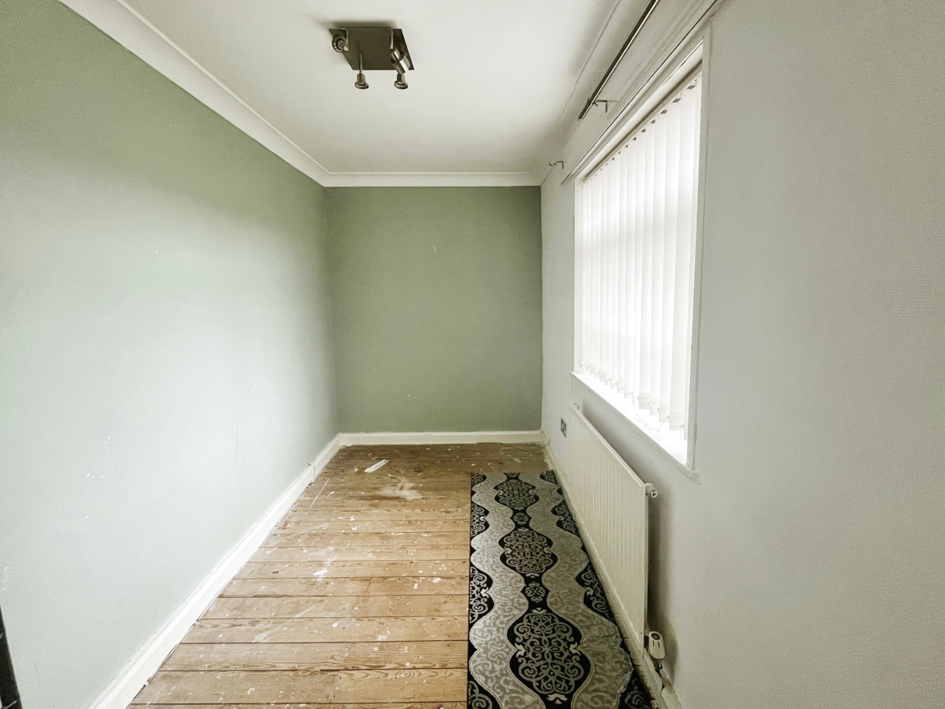 Having laminate flooring, radiator, window to the front elevation and light fitting to the ceiling.