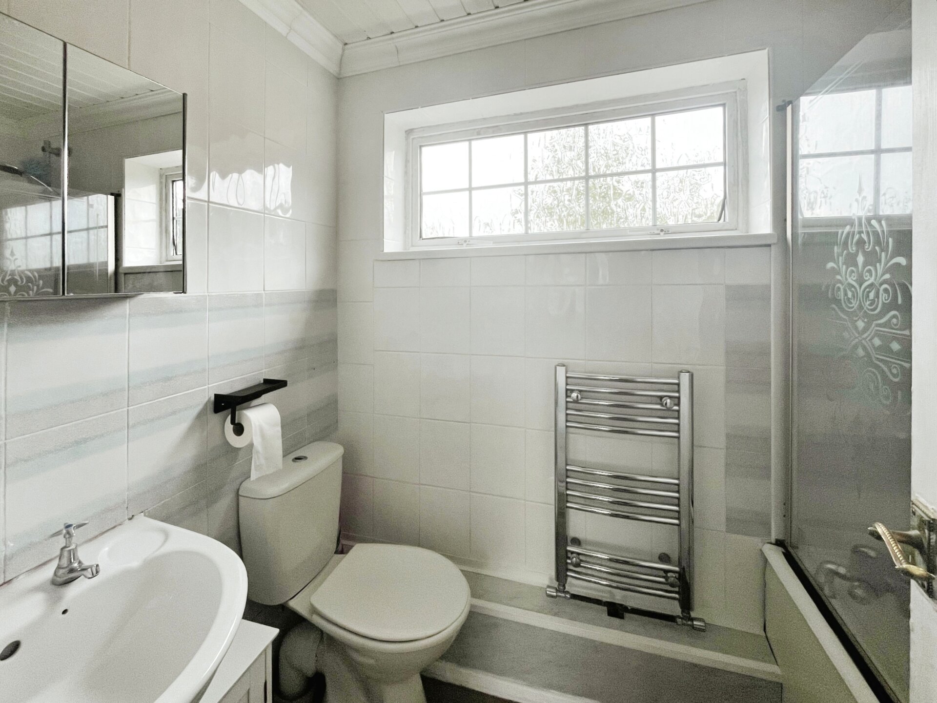 Having laminate flooring, tiled walls, opaque window to the front elevation, ladder style heated towel rail, bathroom suite comprising sink over vanity unit, low level flush w.c, bath with shower over and screen, and light fitting to the ceiling.