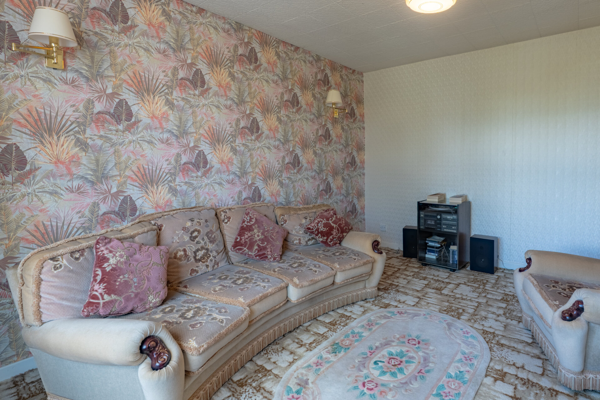 Having carpeted flooring, gas fire with surround, patio doors to the rear, radiator and light fitting to the ceiling.