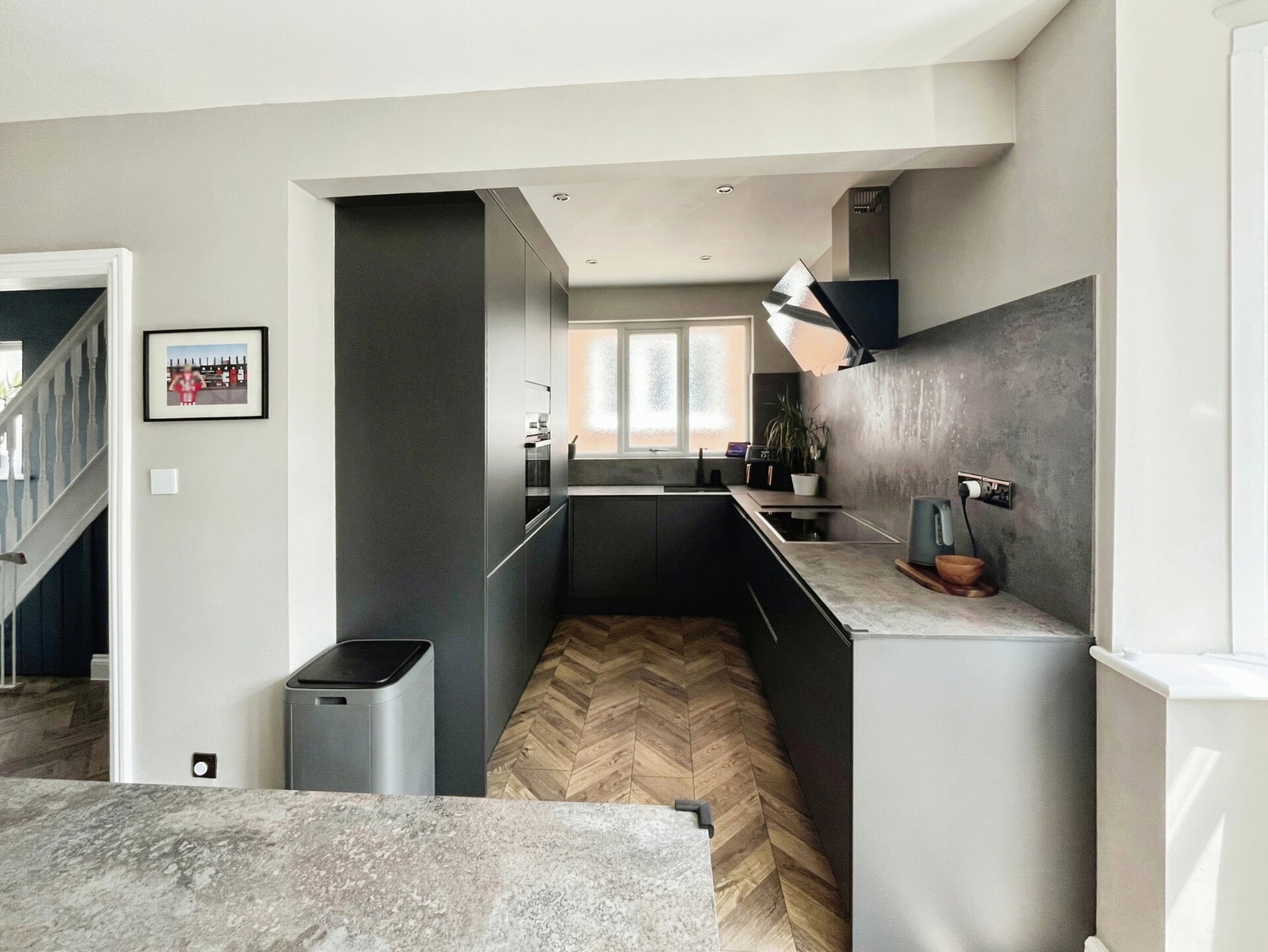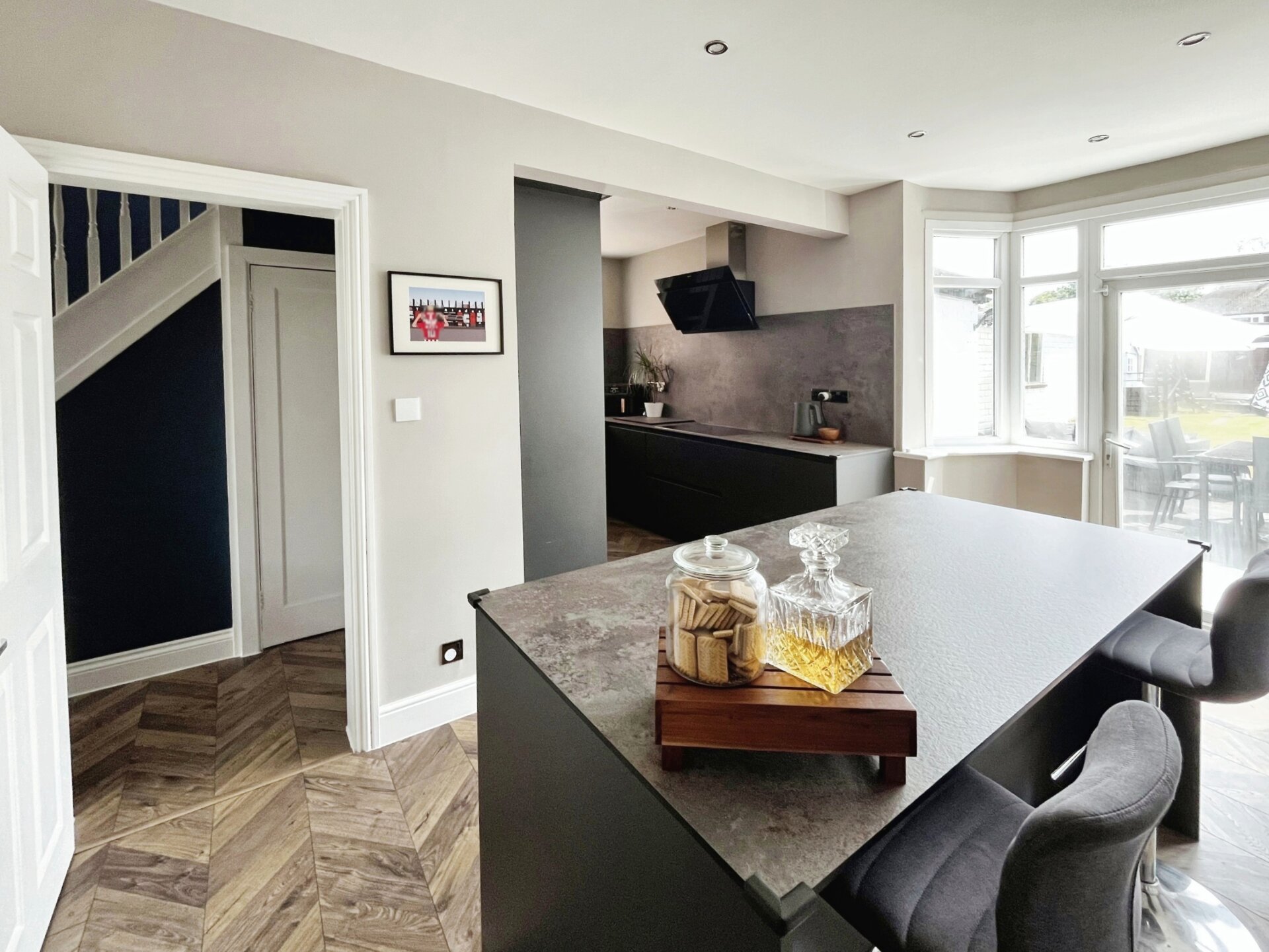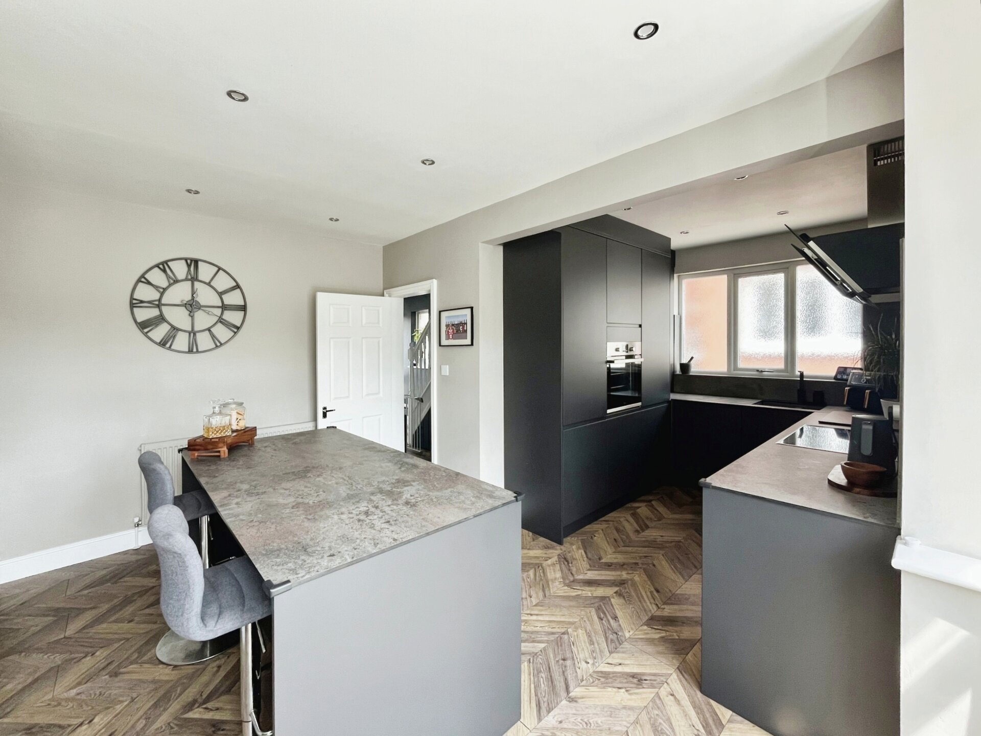 Having laminate flooring, a range of matching wall and base units with work surface over, integrated appliances including hob with extractor over, oven, washing machine and fridge freezer. Having double sink with mixer tap and drainer, opaque window to the side elevation, island with further storage cupboards, door to the rear giving access to the garden, radiator and spotlights to the ceiling.