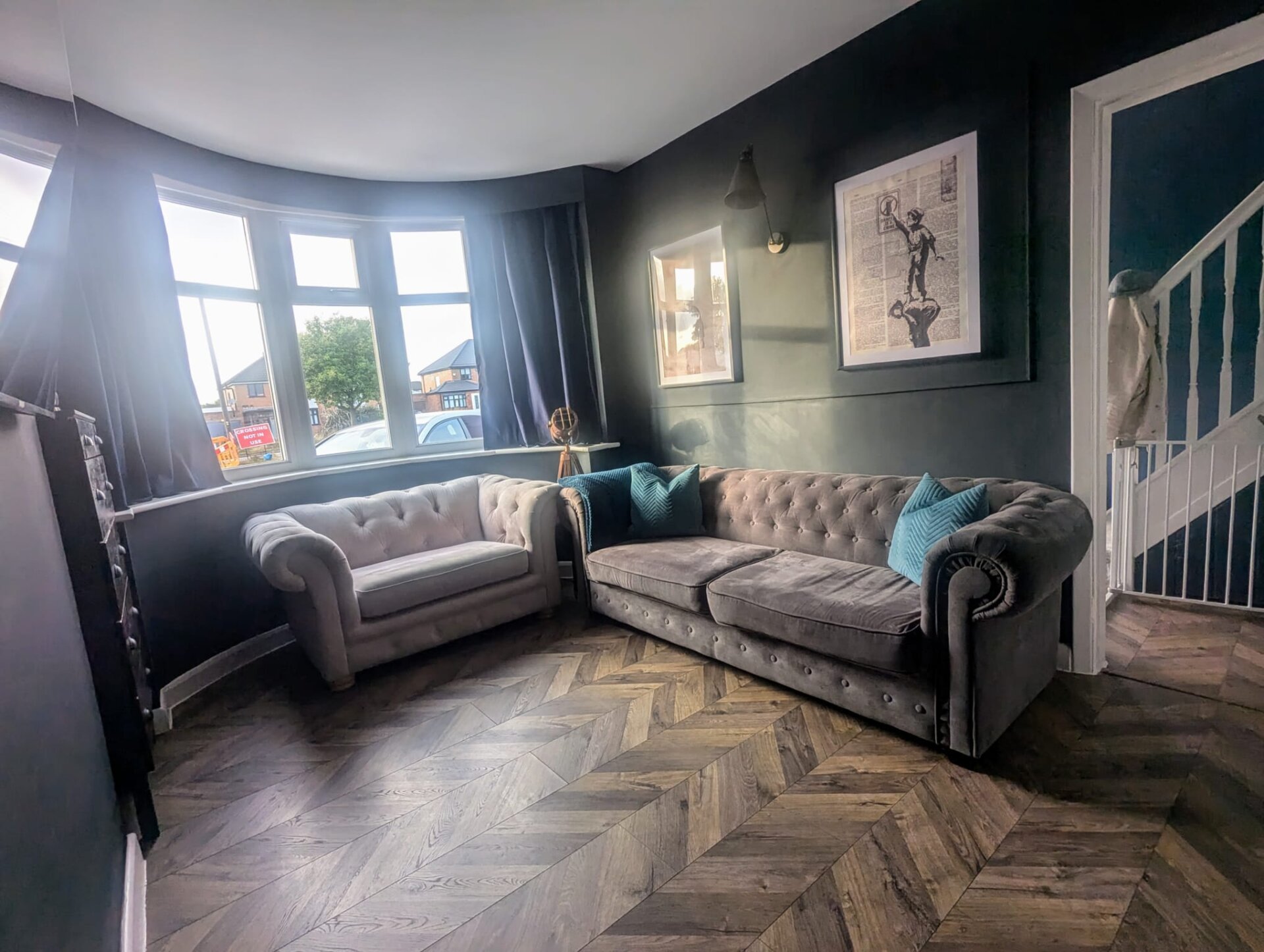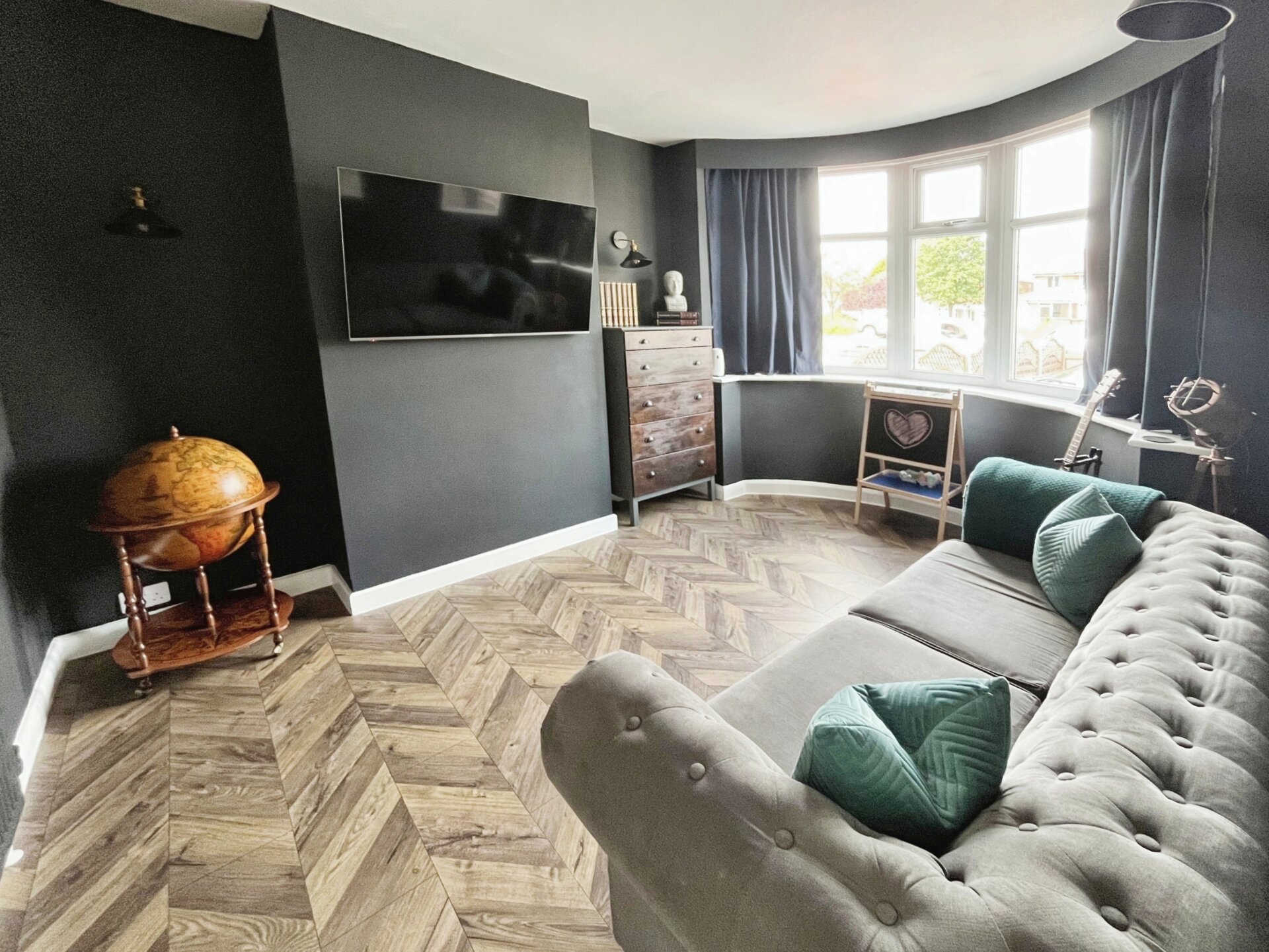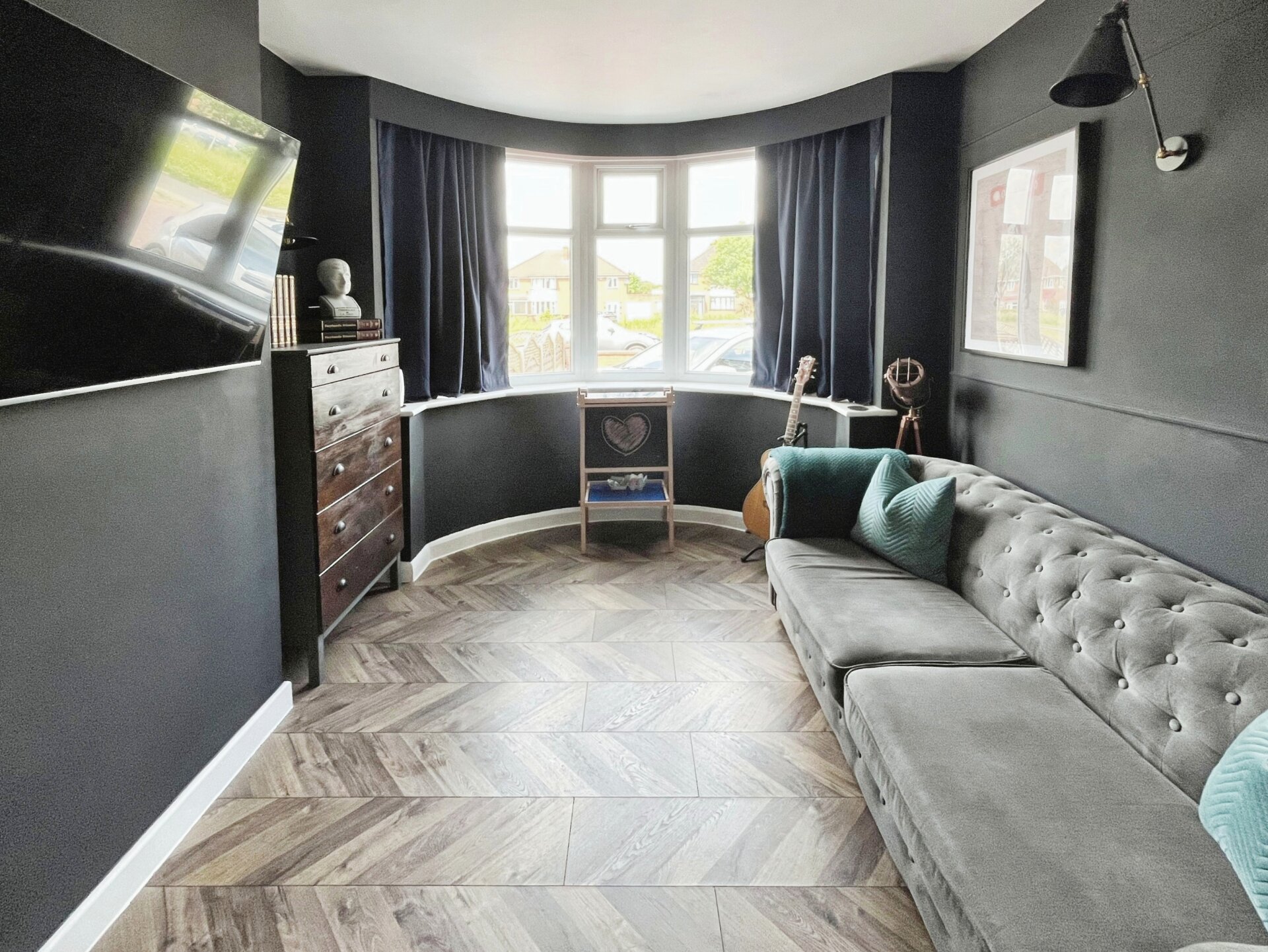 Having laminate flooring, radiator, bay window over looking the front aspect and light fittings to the wall.