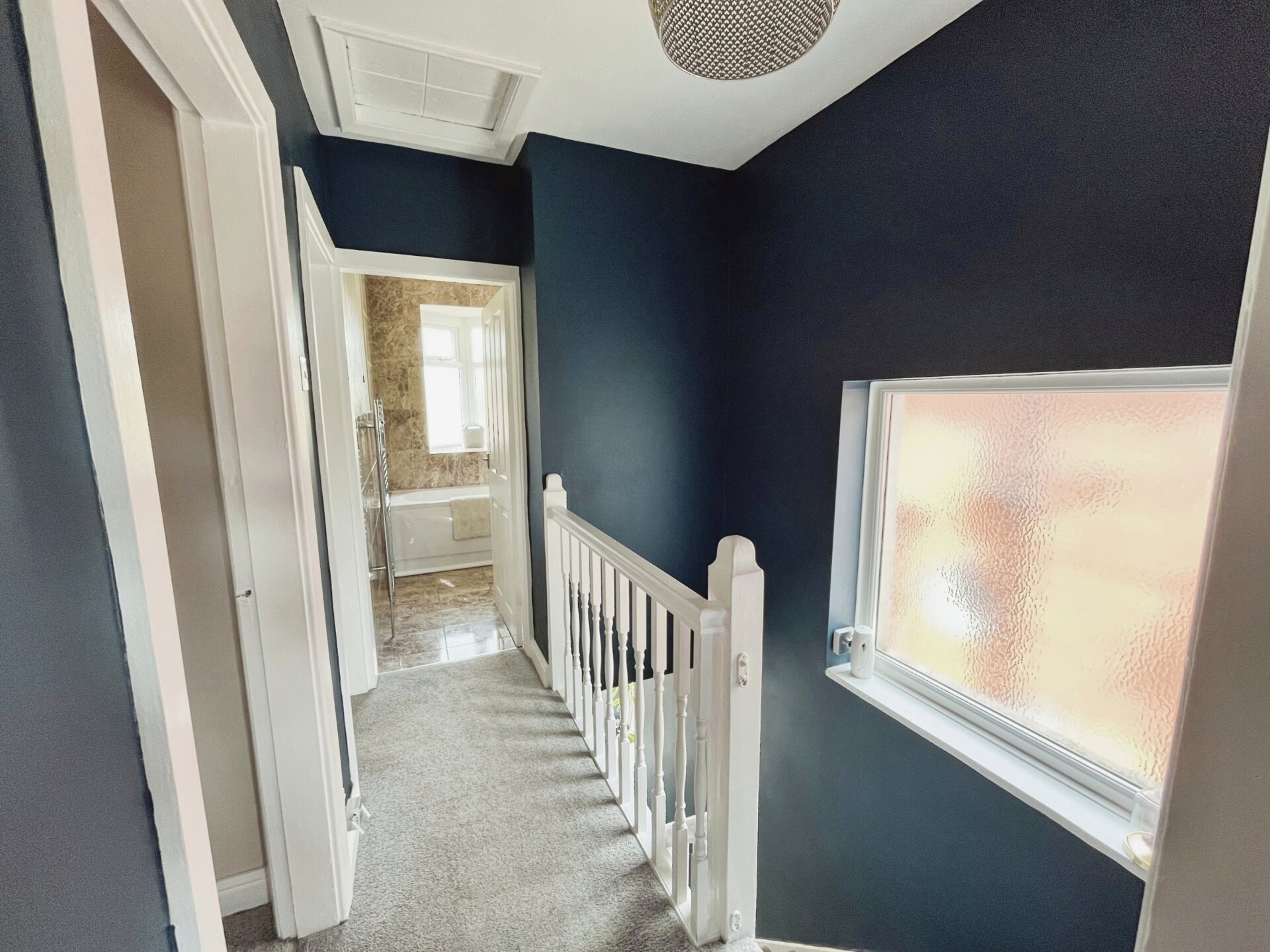 Having carpeted flooring, opaque window to the side elevation, access to the loft, light fitting to the ceiling and doors giving access to bedrooms and bathroom.