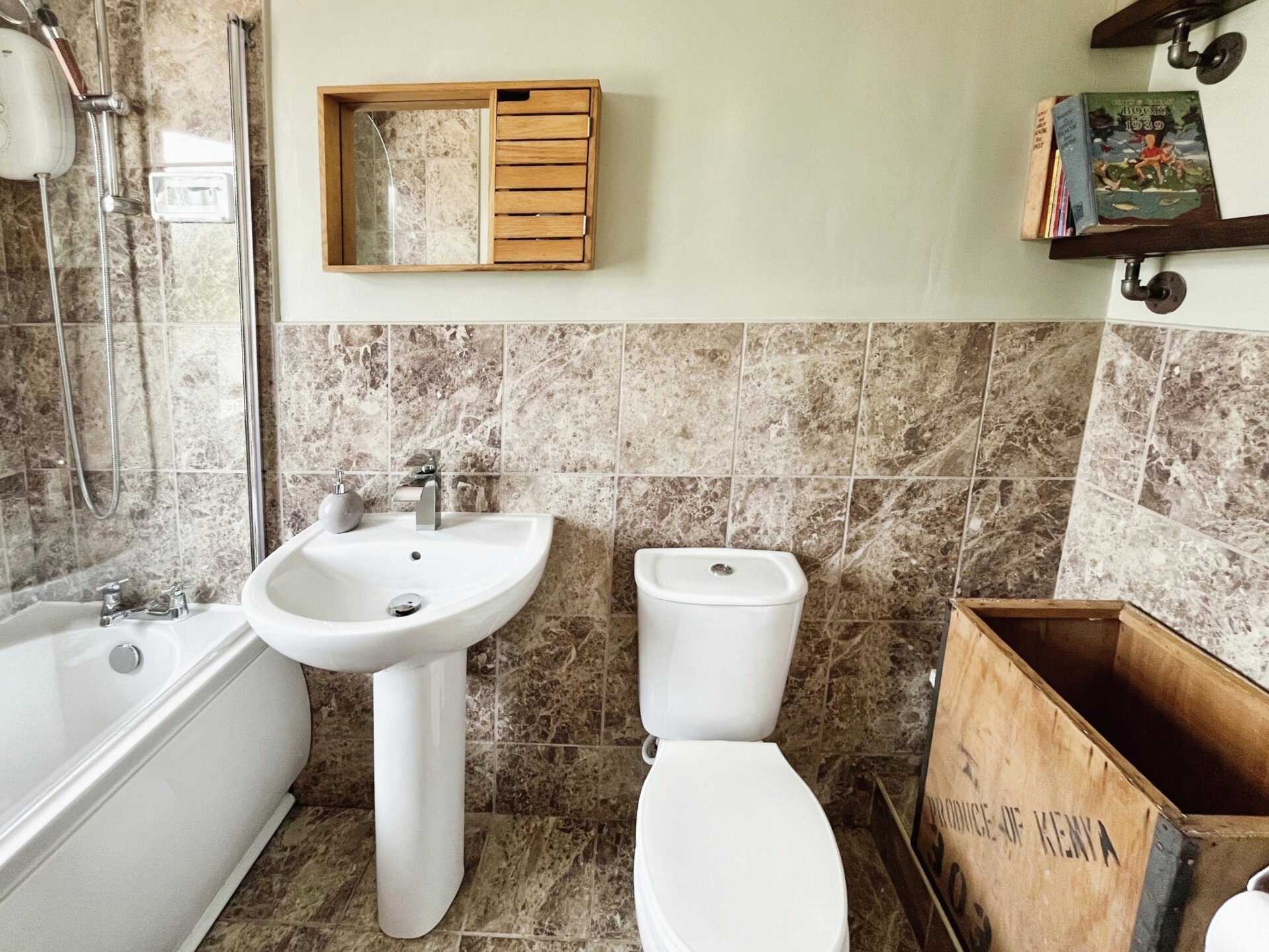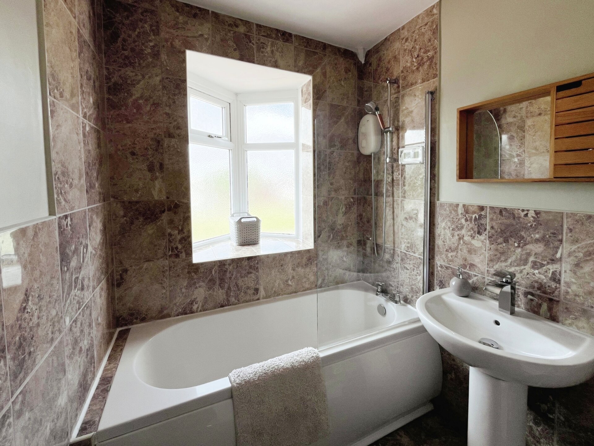 Having tiled flooring and part tiled walls, white bathroom suite comprising, low level flush wc, hand wash basin with mixer tap, bath with shower over and screen, heated style towel rail, opaque window to the front elevation and light fitting to the ceiling.