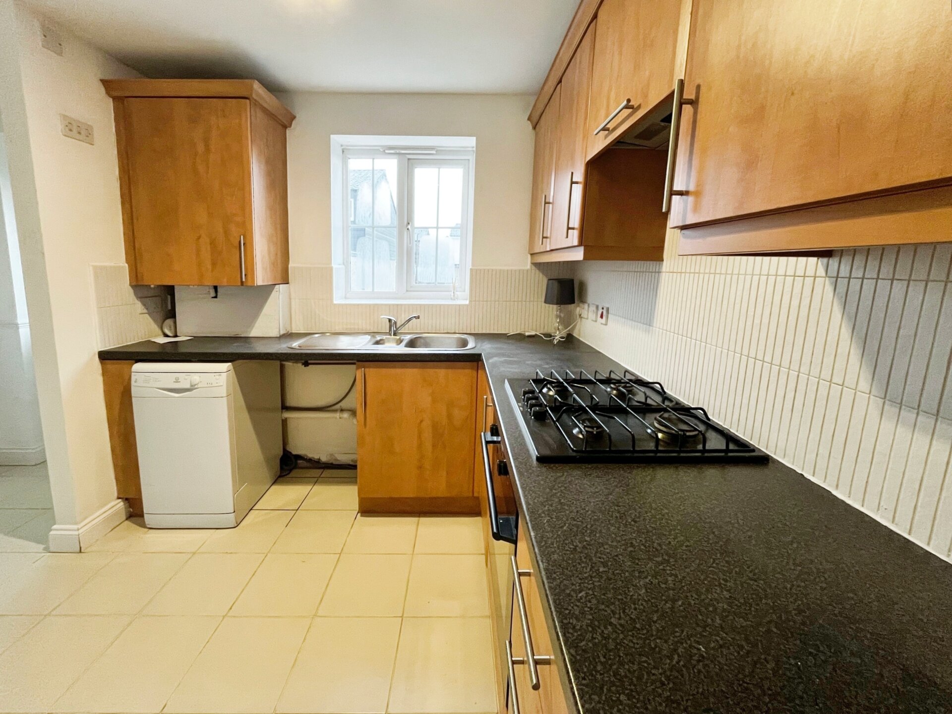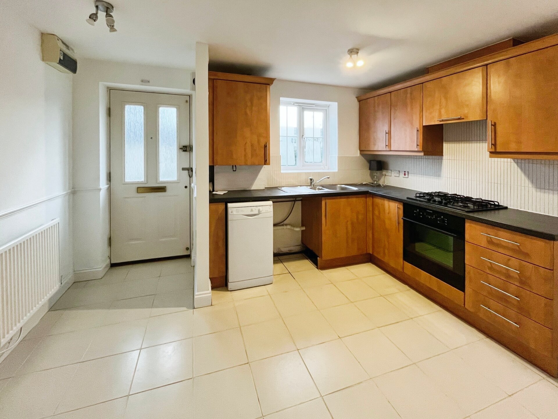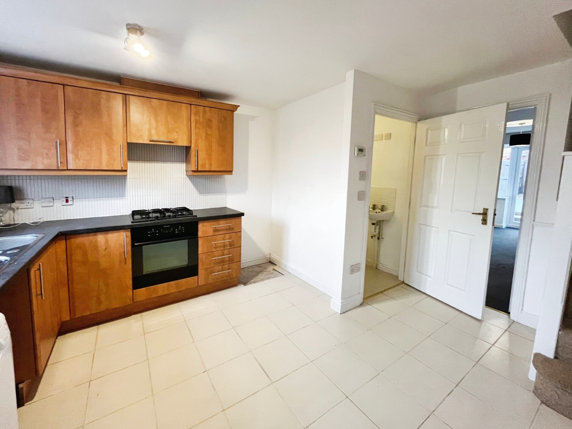 Entrance via a composite front door, having tiled flooring, radiator, carpeted stairs to the first floor, a range of matching wall and base units with work surface over, space for white goods, cupboard housing boiler, stainless steel sink with drainer and mixer tap and tiled splashback, window over looking the front aspect, integrated oven with hob and extractor over, light fitting to the ceiling and doors giving access to guest w.c and lounge.