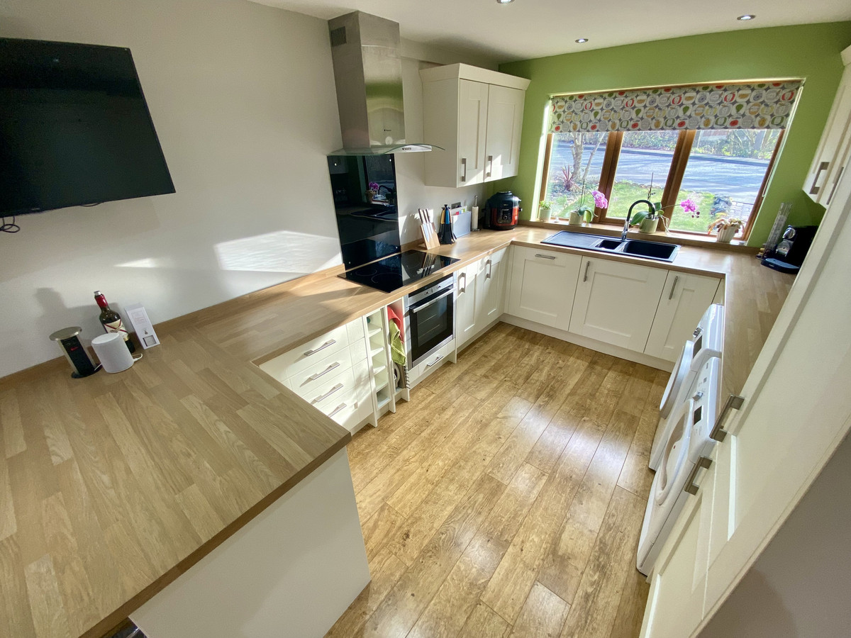 Modern in style is the recently fitted kitchen, with cream fitted wall and base units and wood effect laminate worktops. The kitchen benefits from having fitted appliances such as Neff Oven, Hob, Extractor fan, Neff Dishwasher and Fridge/Freezer.