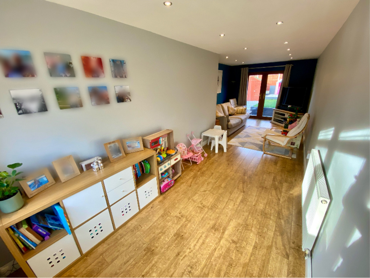 With oak effect laminate flooring, UPVC double glazed French doors to rear garden, inset spotlights to ceiling, TV point, UPVC double glazed window to front elevation and radiators.
