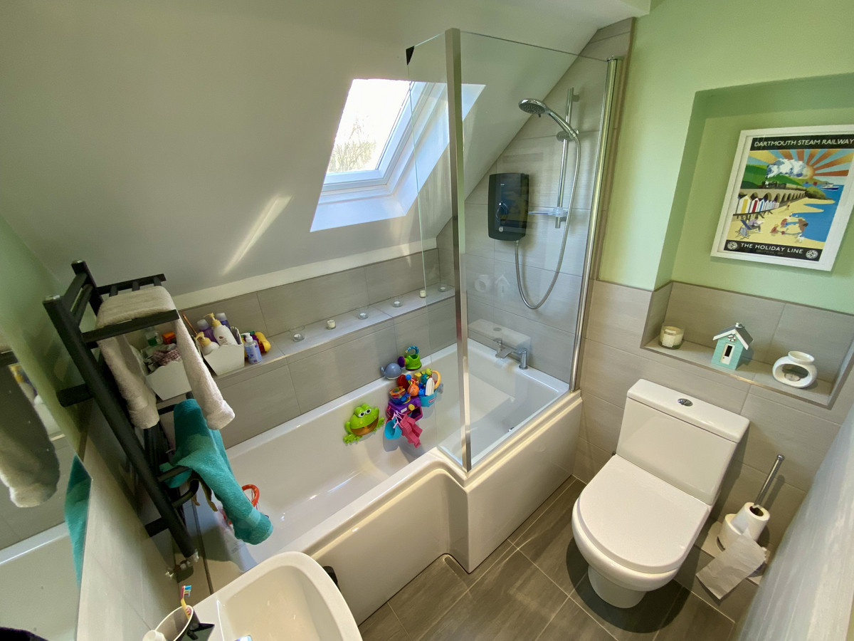 Fitted with a three piece white suite comprising of low level WC, pedestal hand wash basin, L shaped bath with electric shower over, double glazed skylight window to front elevation, radiator, spotlights to ceiling and extractor fan.