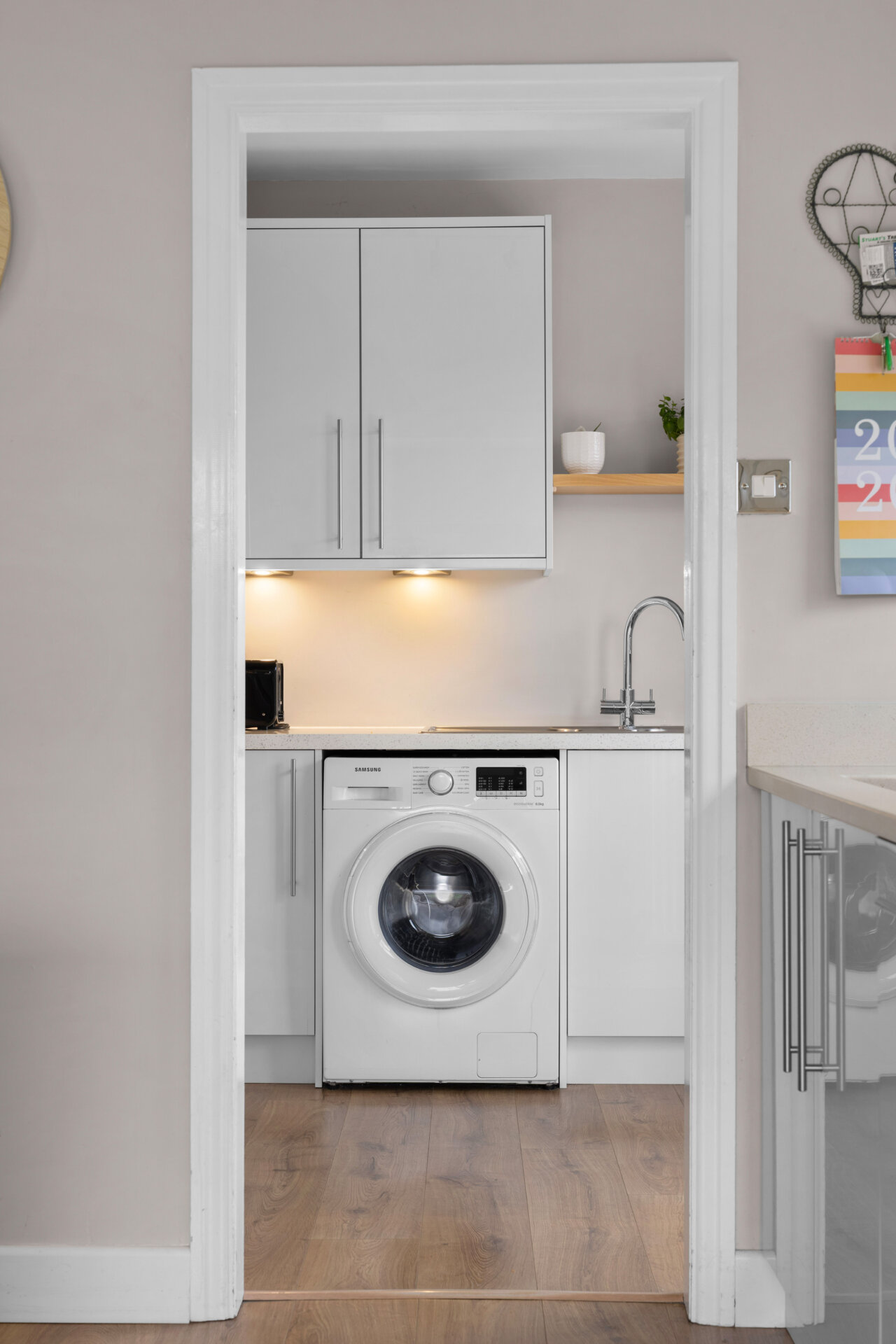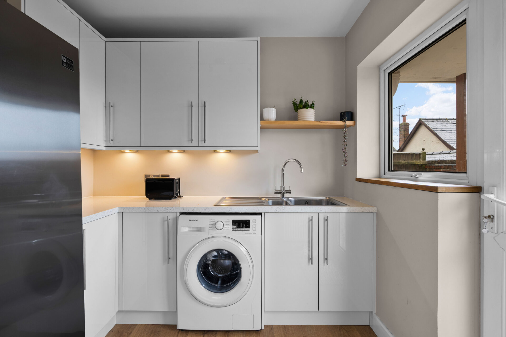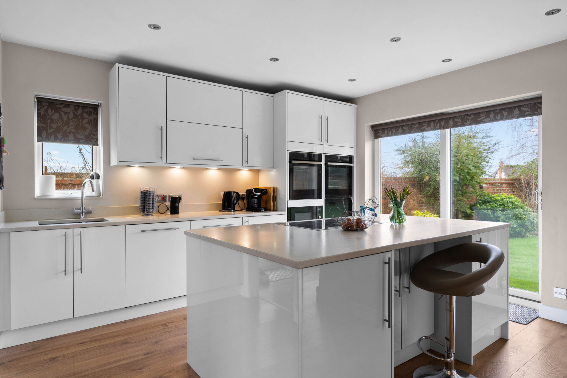 At the heart of the home sits an open-plan kitchen, dining and living area designed for connection and everyday practicality. This is a space that anchors family life — generous enough for entertaining yet comfortable enough for daily routine. A separate utility room ensures the working elements of the house remain discreet and organised.