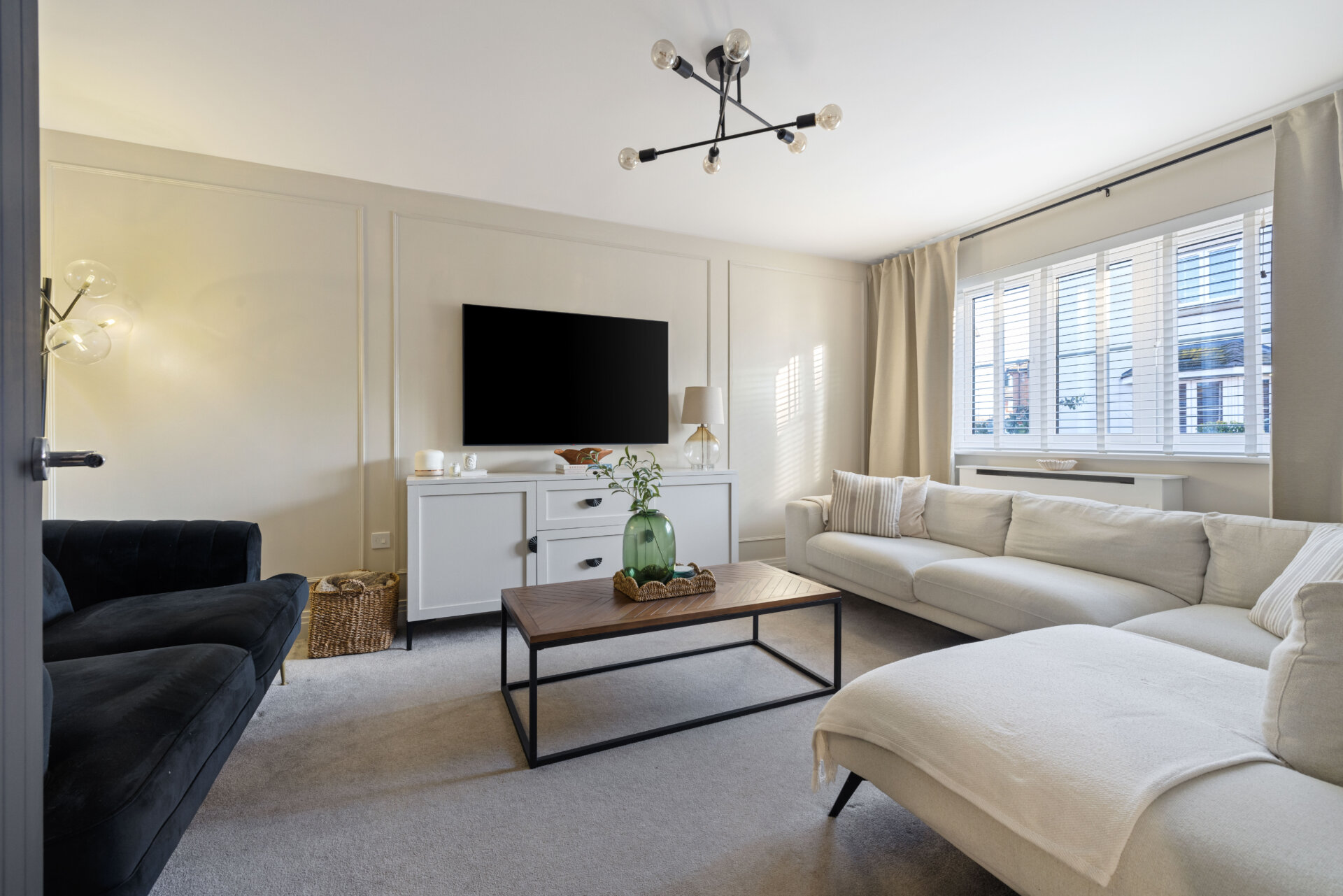 Capturing the morning sun the living room, positioned to the front of the property is a stylish, inviting space, tastefully adorned with feature panelled walls - a cosy retreat for the end of day.