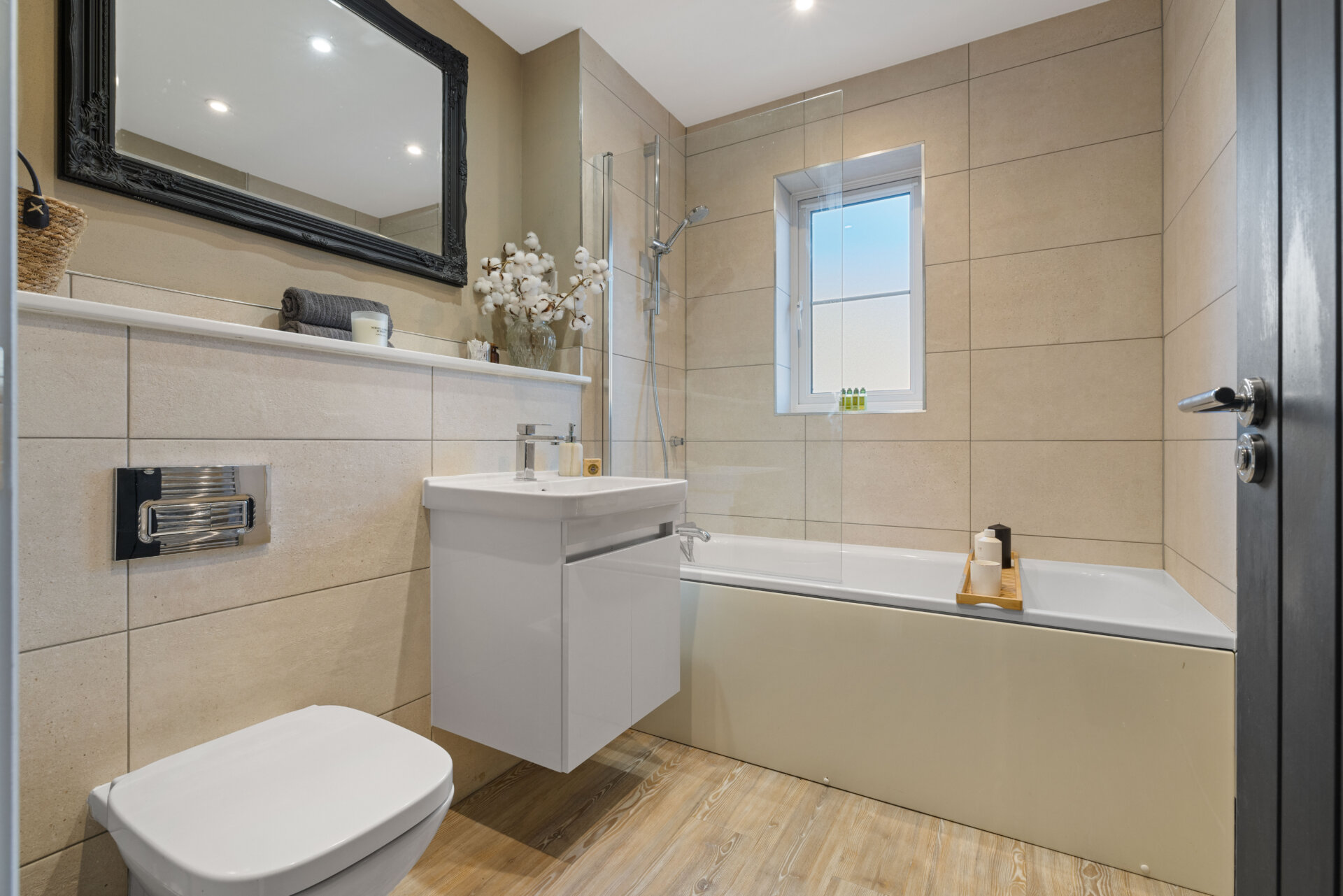 The family bathroom is finished to a high standard with large statement tiles, a heated towel rail, and fitted with a bath, hand wash basin, vanity unit and wall hung toilet.