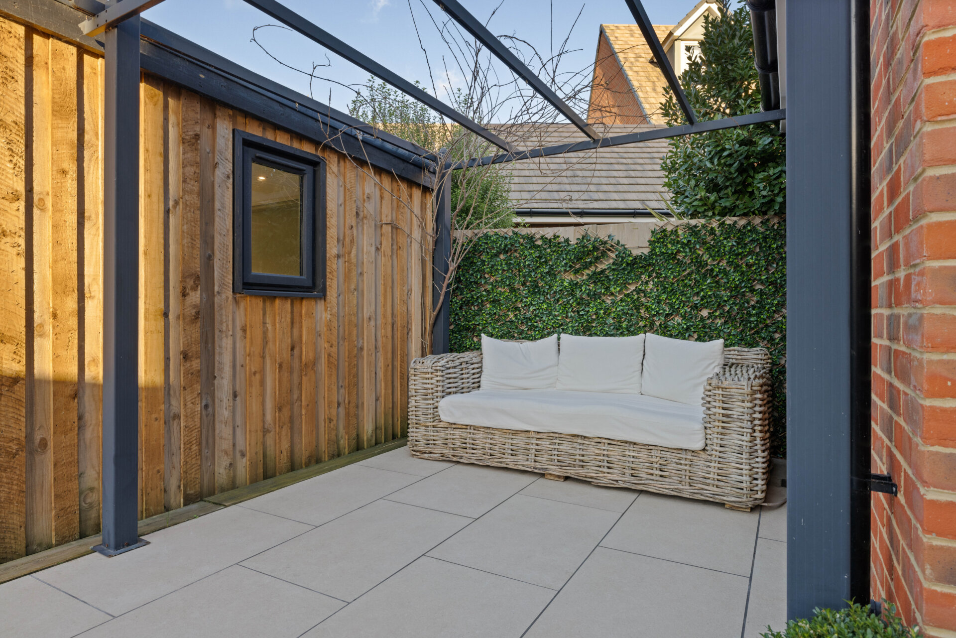 From the kitchen diner, double doors lead you to a landscaped garden, with generous porcelain patio and pergola, providing a wonderful outdoor space for relaxing and offering a great entertaining area. To the rear is a detached insulated garden studio, extending the overall footprint of the home. This flexible space is well suited for use as an office, gym, studio or hobby room, highlighting the versatility on offer.