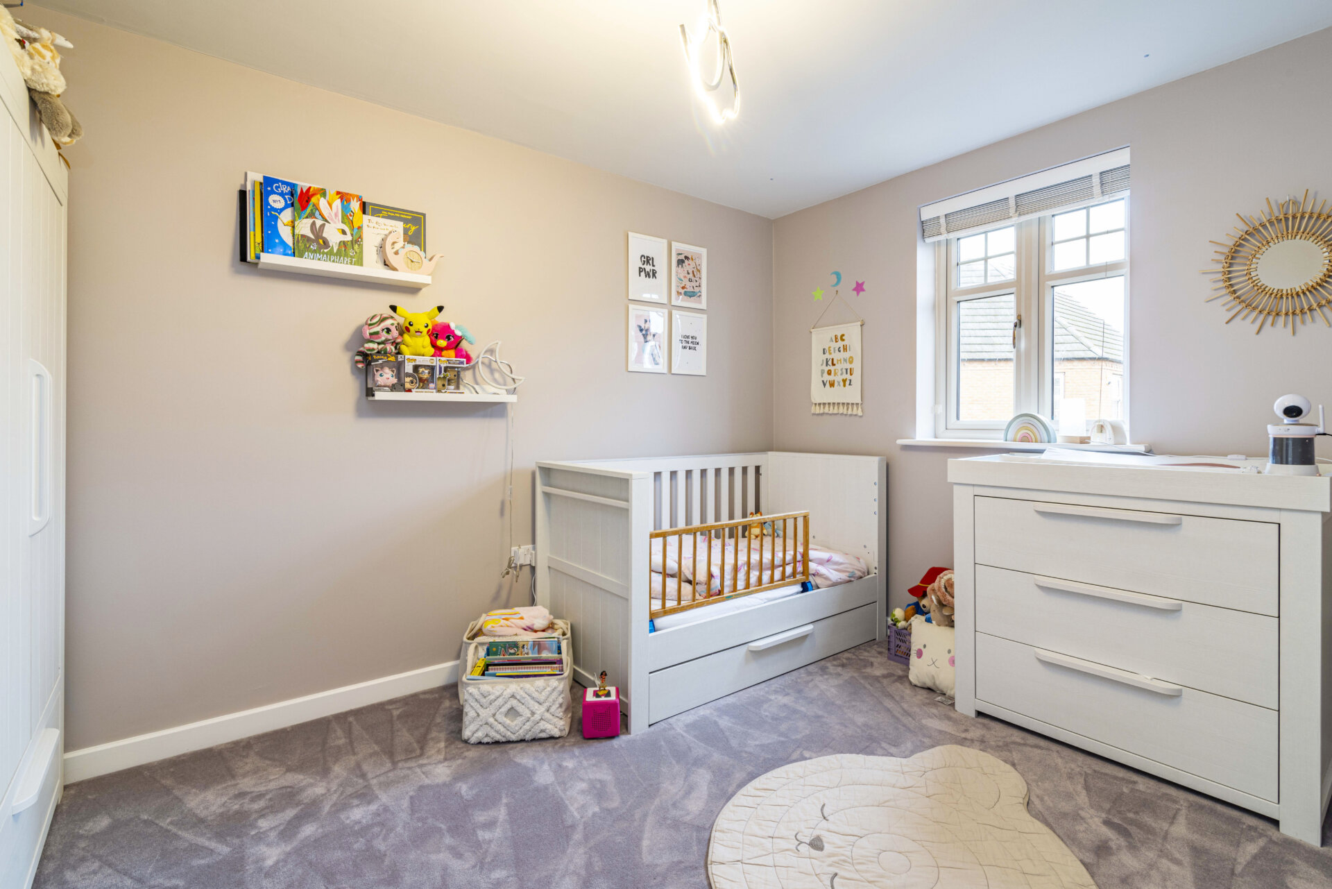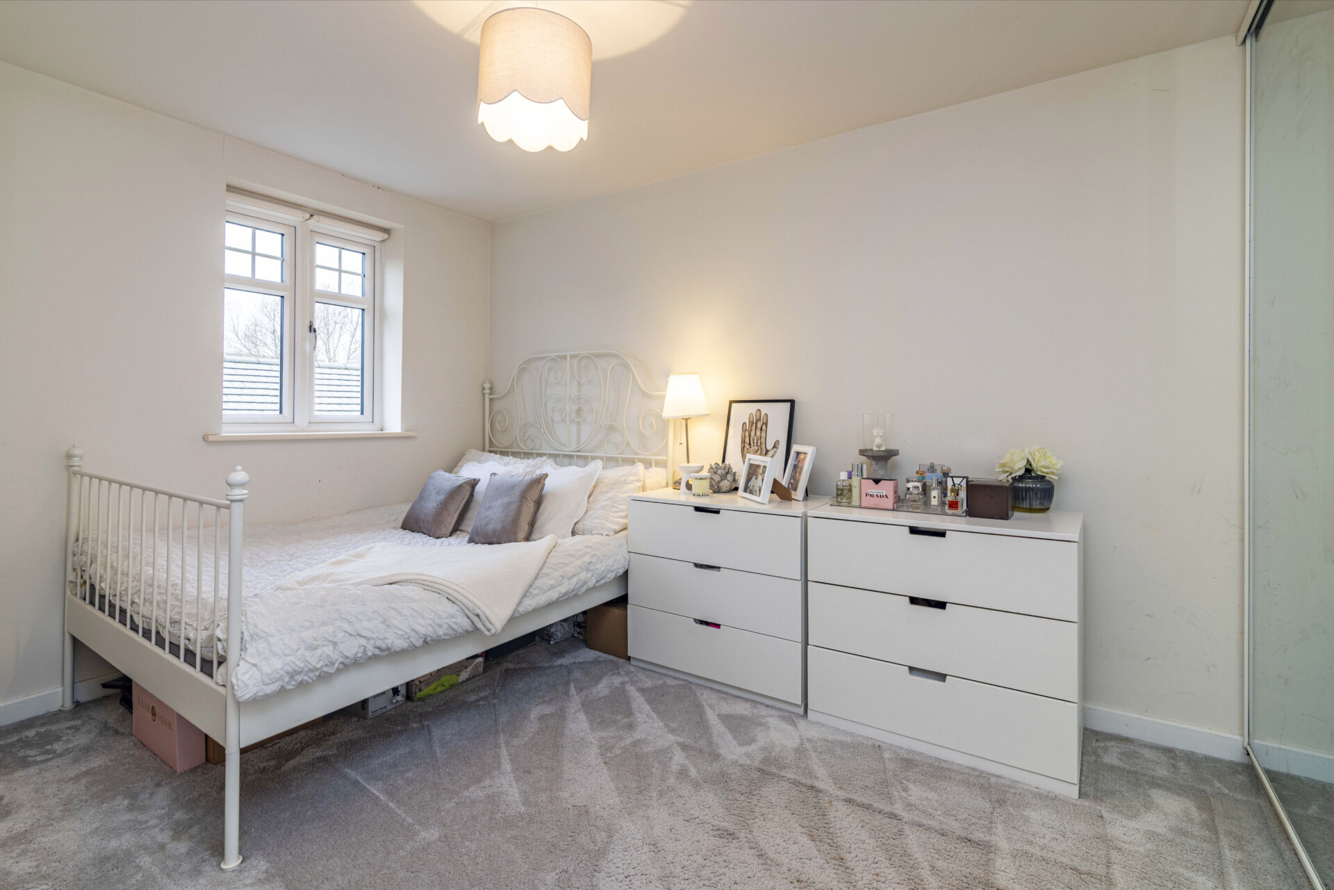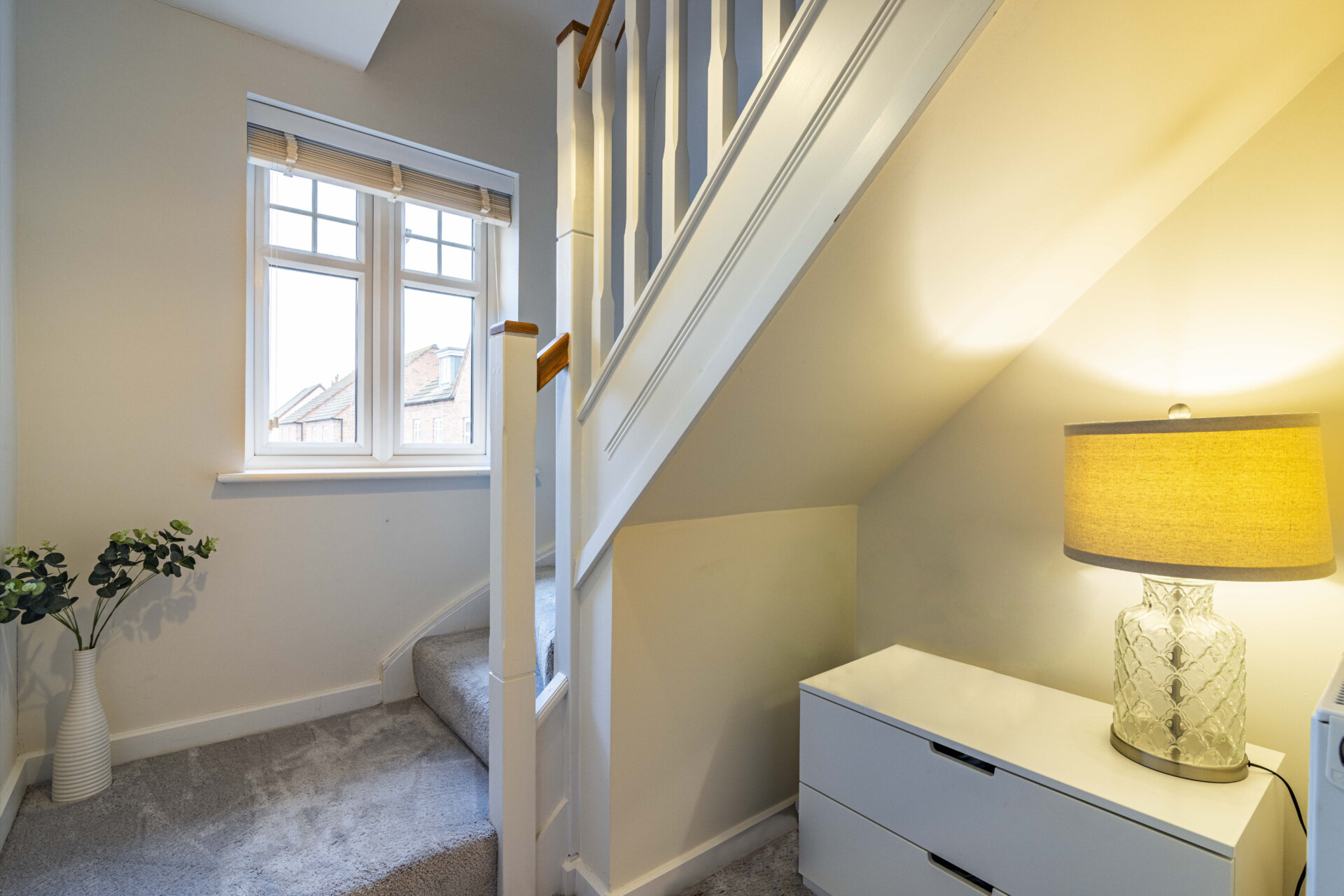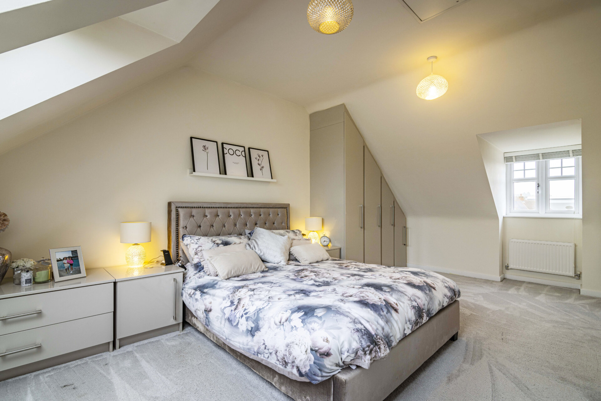 The first-floor landing opens onto a modern family bathroom and two generously-sized double bedrooms. The third bedroom faces the front, while the second bedroom at the rear boasts fitted sliding wardrobes, offering an abundance of storage. A secondary landing area here provides an additional transition space and leads to the upper master suite, creating a sense of flow throughout the home.