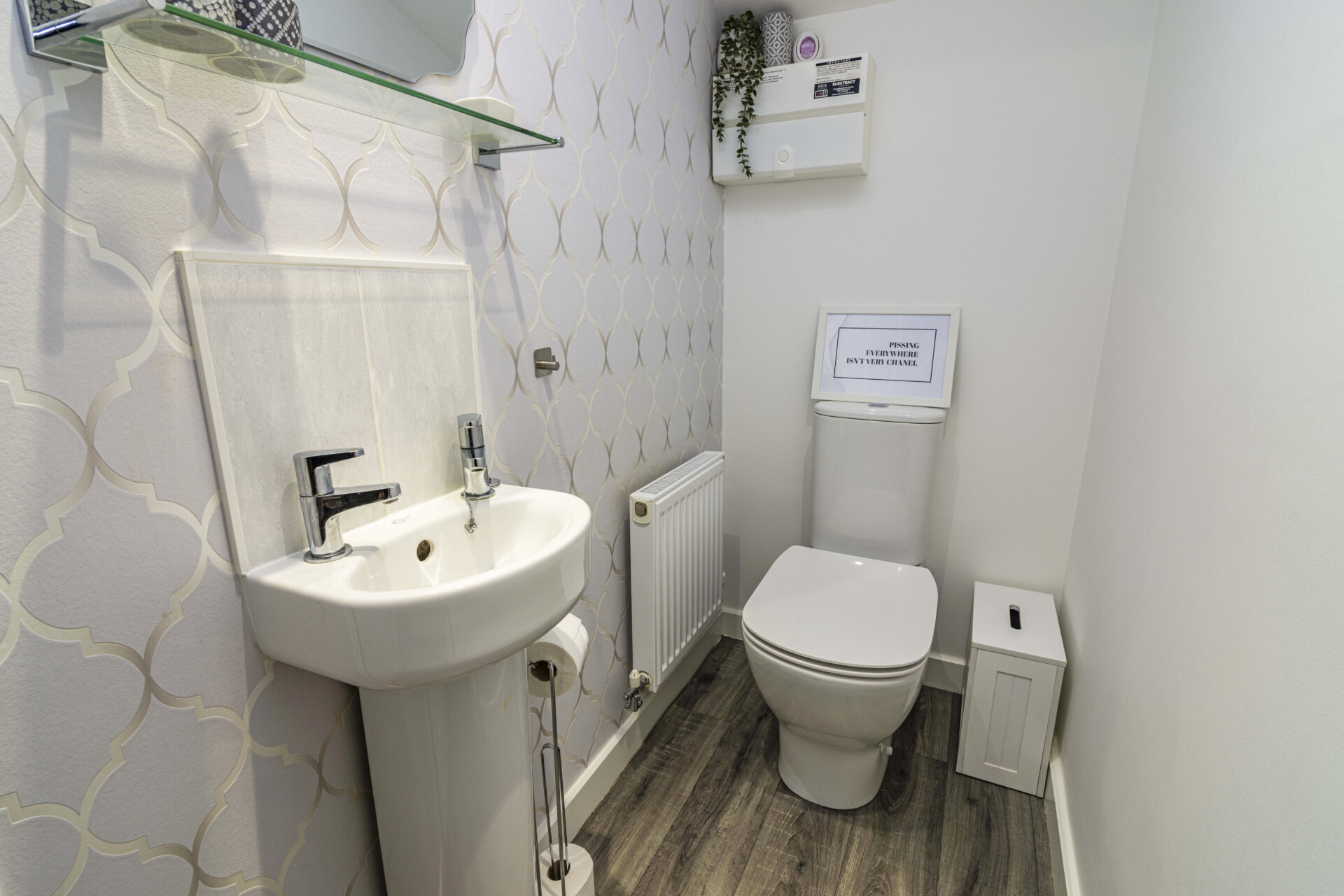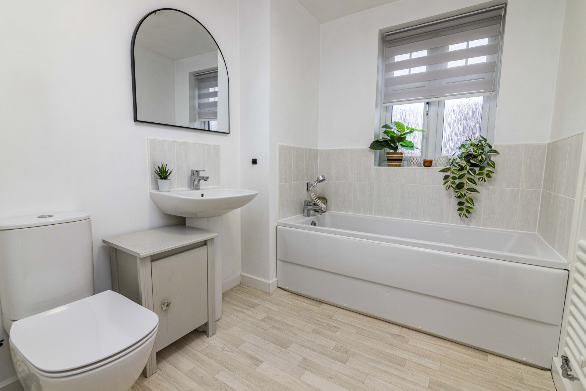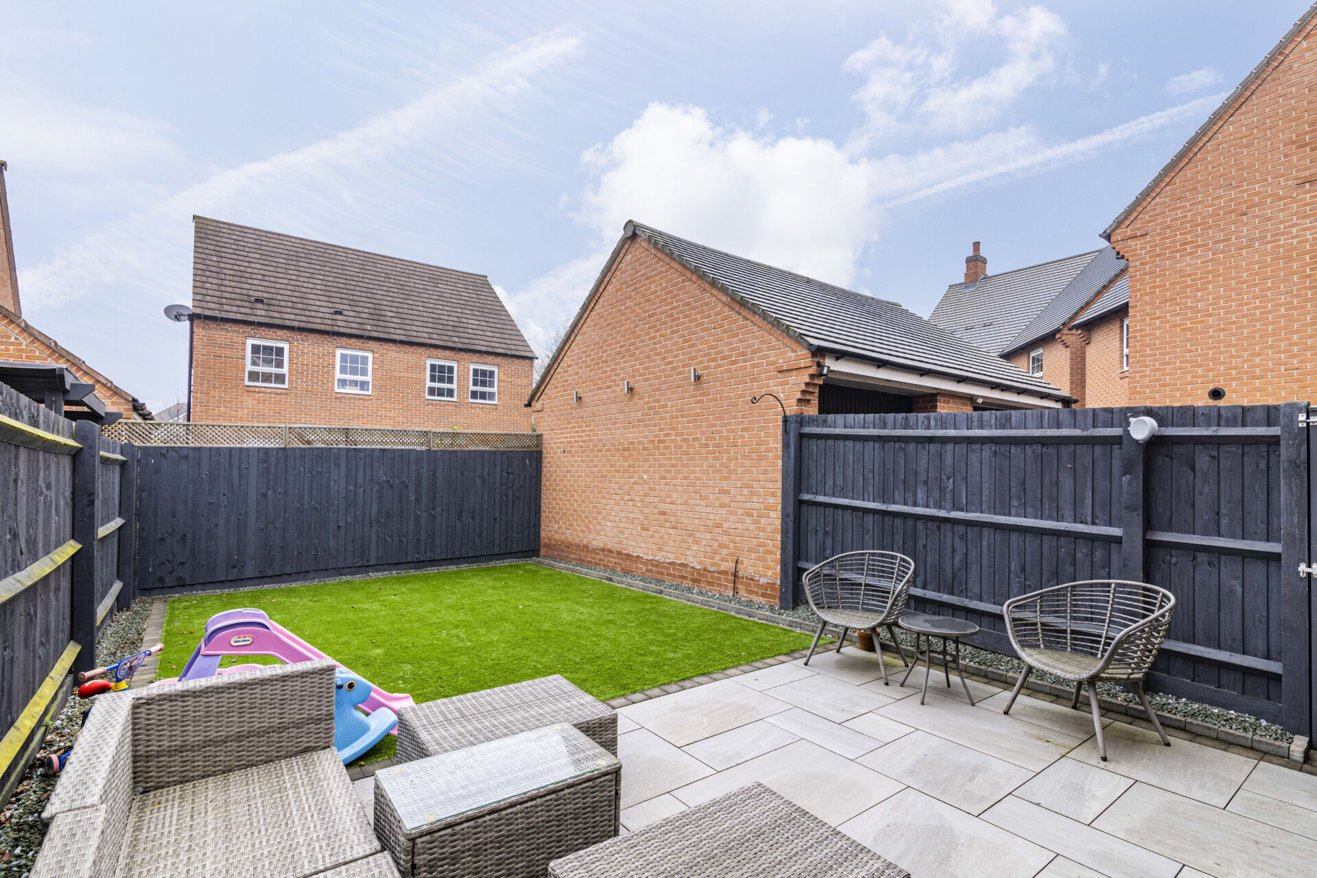 Upon entering, you’re greeted by a welcoming entrance hall leading to a convenient downstairs W/C. The front-facing lounge features a bright bay window, flooding the room with natural light, along with an understairs cupboard that provides ample storage space. The open-plan kitchen/diner is perfect for entertaining, equipped with a Zanussi fitted oven and hob, with options to keep additional white goods. French doors lead out from the kitchen to a beautifully renovated rear garden, featuring sleek porcelain slab paving, stylish up-and-down lighting, low-maintenance artificial grass, and access to both the garage and driveway.