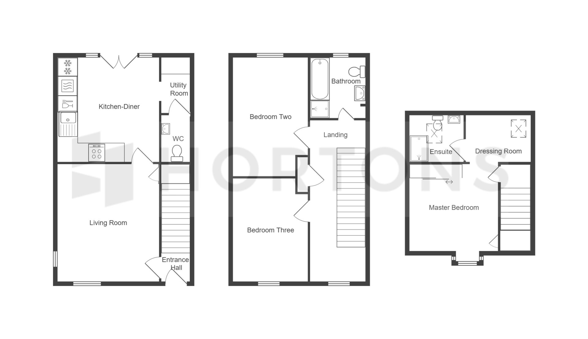 Boasting a thoughtfully designed layout across three floors, the home offers three spacious double bedrooms, providing versatile accommodation to suit a variety of needs. The impressive master suite occupies the entire top floor, featuring a generous bedroom, dedicated dressing area, and a private en-suite, creating a luxurious and secluded retreat. The first floor hosts two further well-proportioned double bedrooms, alongside a contemporary four-piece family bathroom comprising a bath, separate shower, WC, and wash basin, delivering both practicality and style.