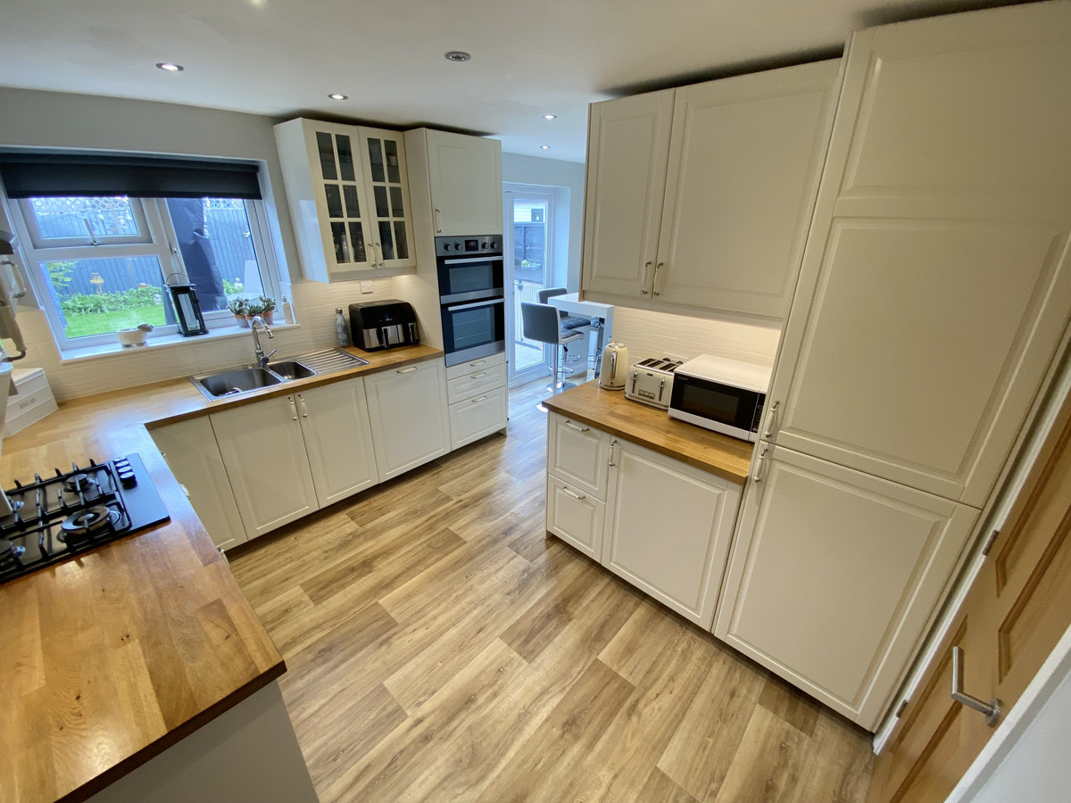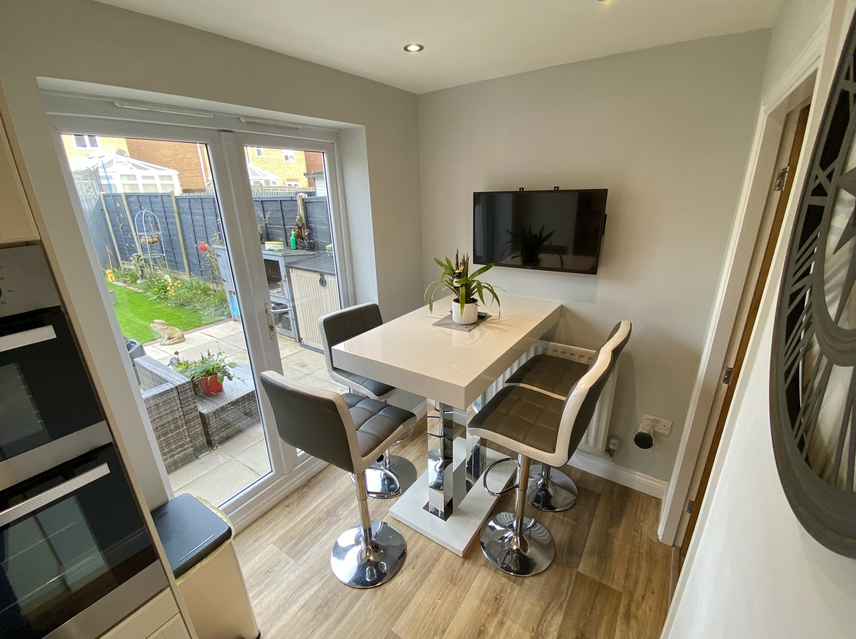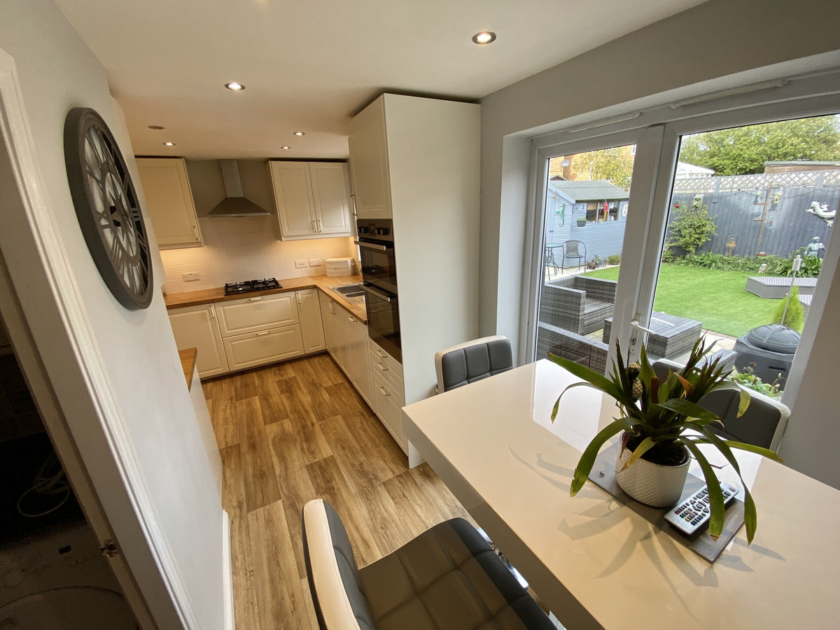 Breakfast Kitchen - 2.76m widening to 5.00m x 3.44m narrowing to 1.74m - Modern and stylish base and wall cupboards, one and a quarter bowl stainless steel sink unit, built in oven, four ring hob, filtration hood, tiled splashbacks, breakfast table, 2 radiators, double glazed window to rear and uPVC double glazed French window to garden. An additional storage cupboard beneath staircase.