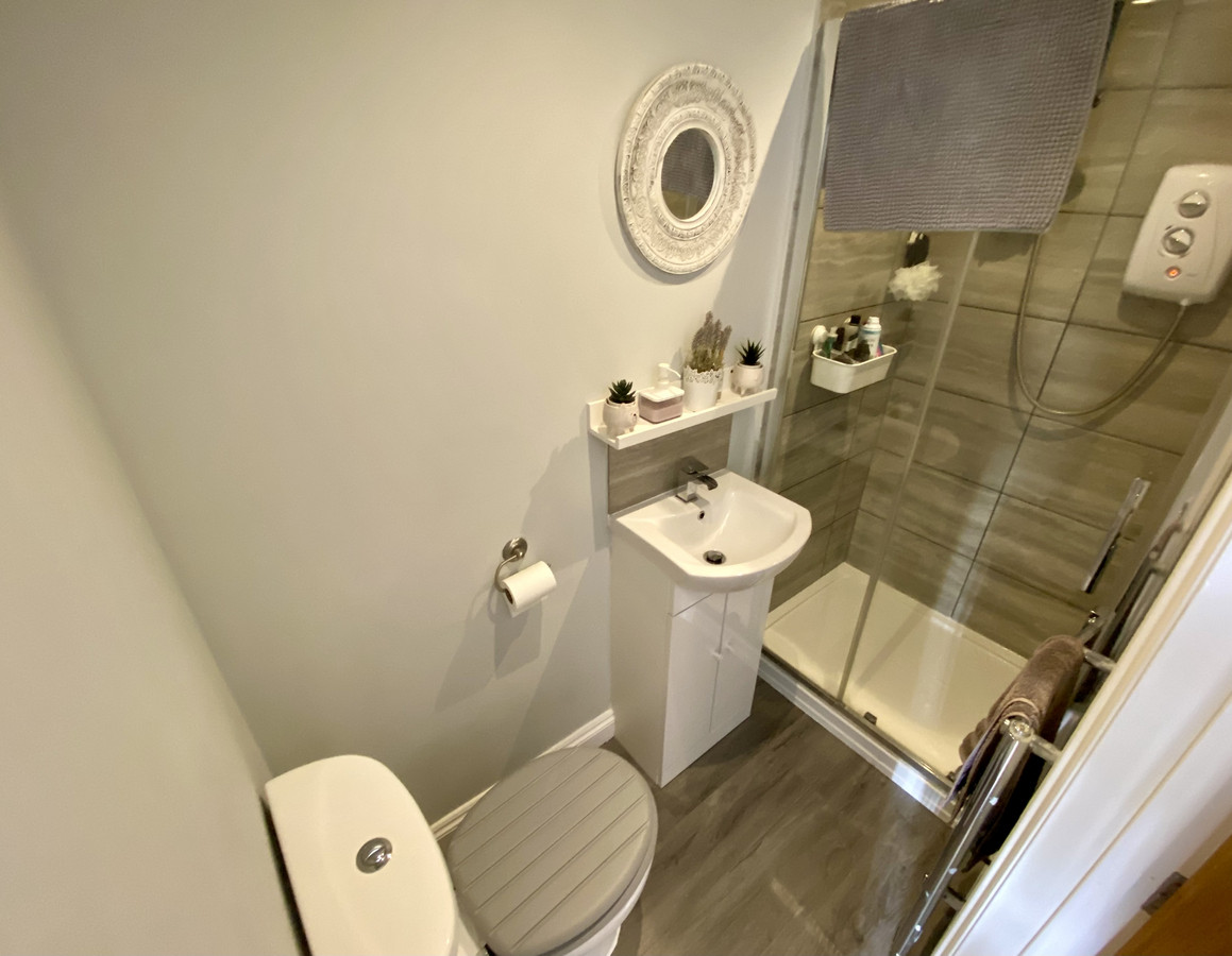 Shower Room - With white suite having chrome finished fittings comprising tiled shower cabinet, wash hand basin, tiled splashback, low level W/C, chromium finished heated towel rail, inset downlights, ceiling mounted fan and wall cupboard/mirror.