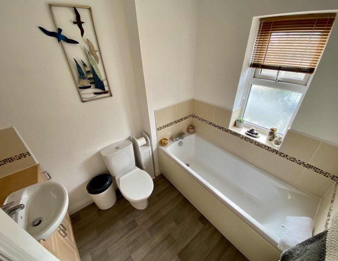 Family Bathroom - With white suite having chrome finished fittings comprising of a fitted bath, vanity unit, tiled splashbacks, low level W/C, chrome heated towel rail, shaver point and double glazed window to front.