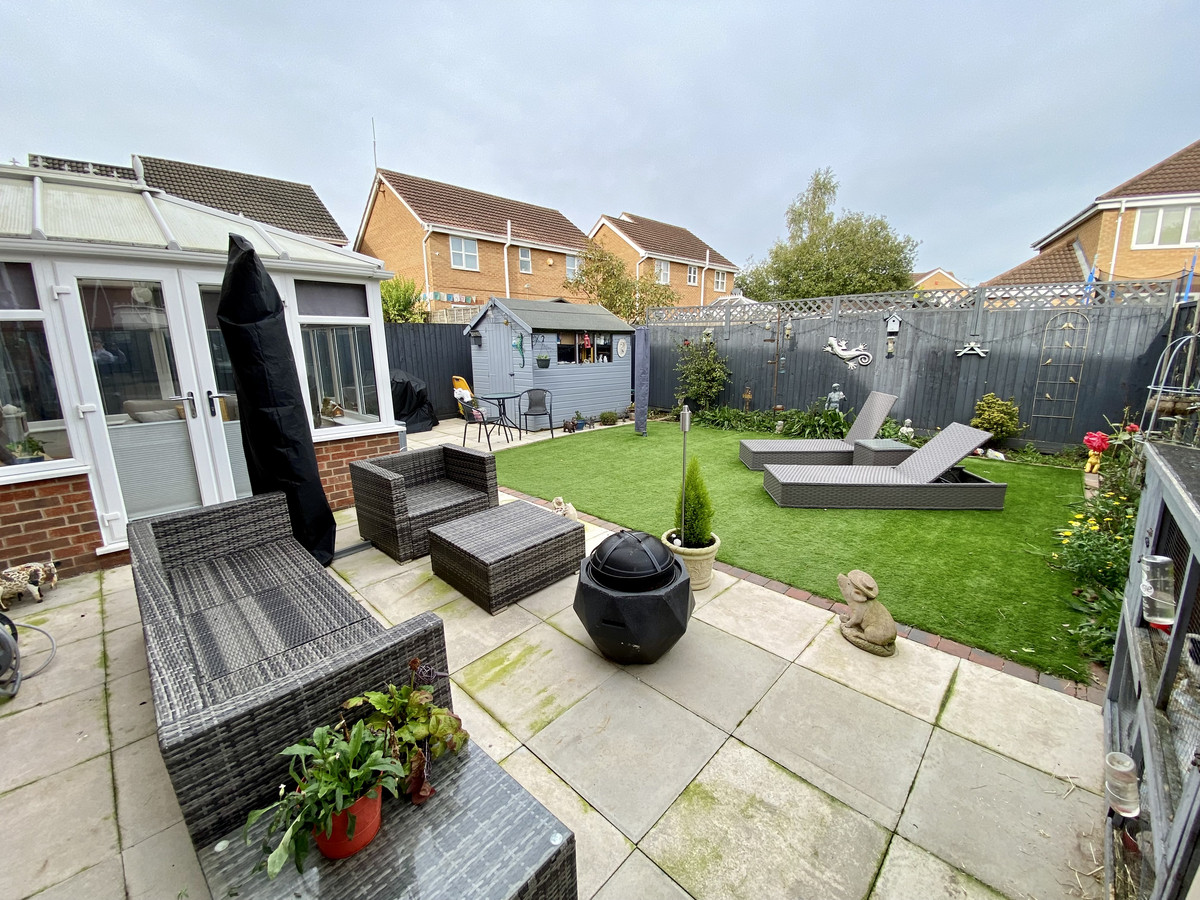 Exterior Rear - Large patio area that's perfect for relaxing or some al fresco dining, also beyond is a artificially turfed area, which is great for those of us who love a low maintenance garden. There is also a shed to the side of the property and a separate side entrance with light and gate to front.