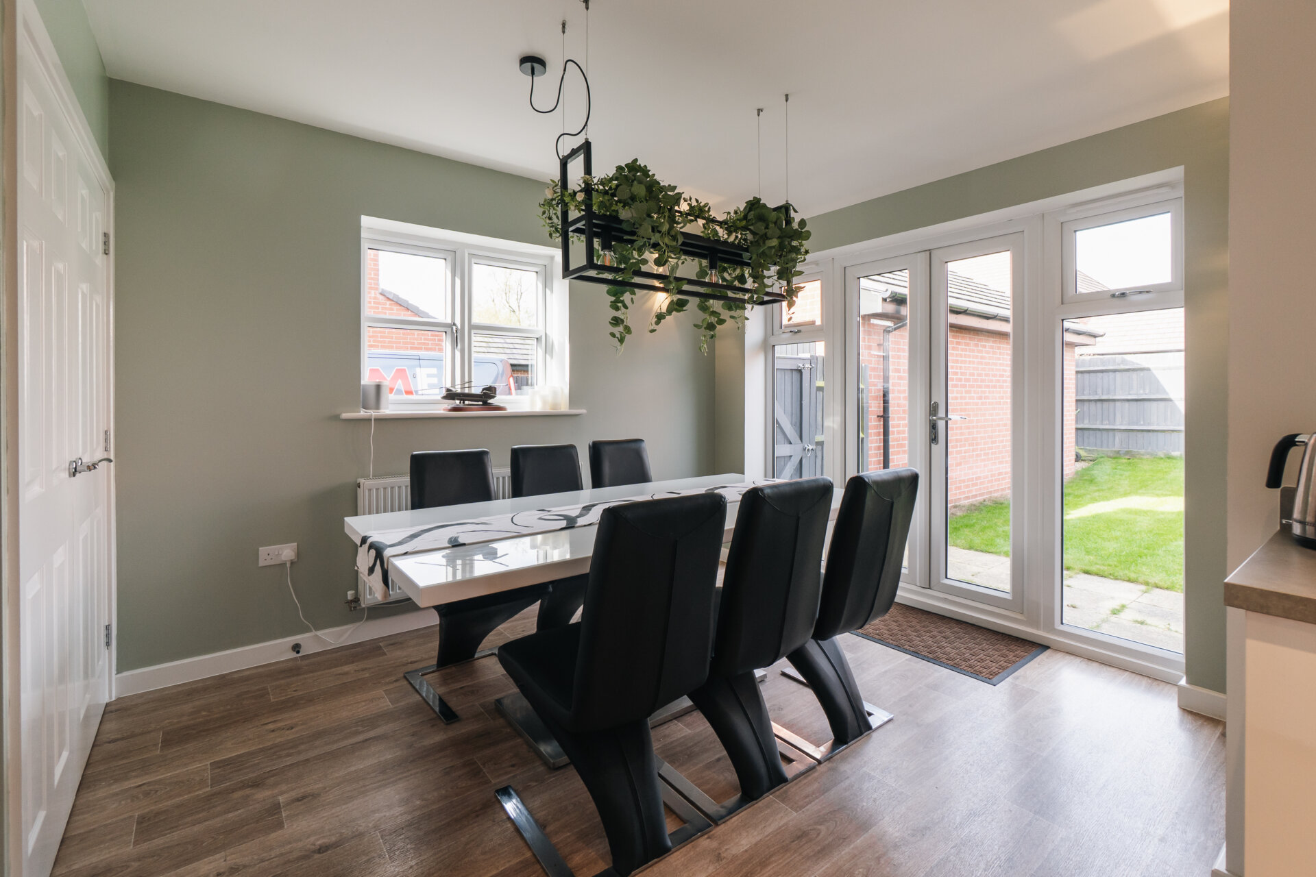 A large, open-plan kitchen and dining space with plenty of room for family meals and entertaining. Equipped with modern fittings and ample storage. Also includes separate utility cupboard.