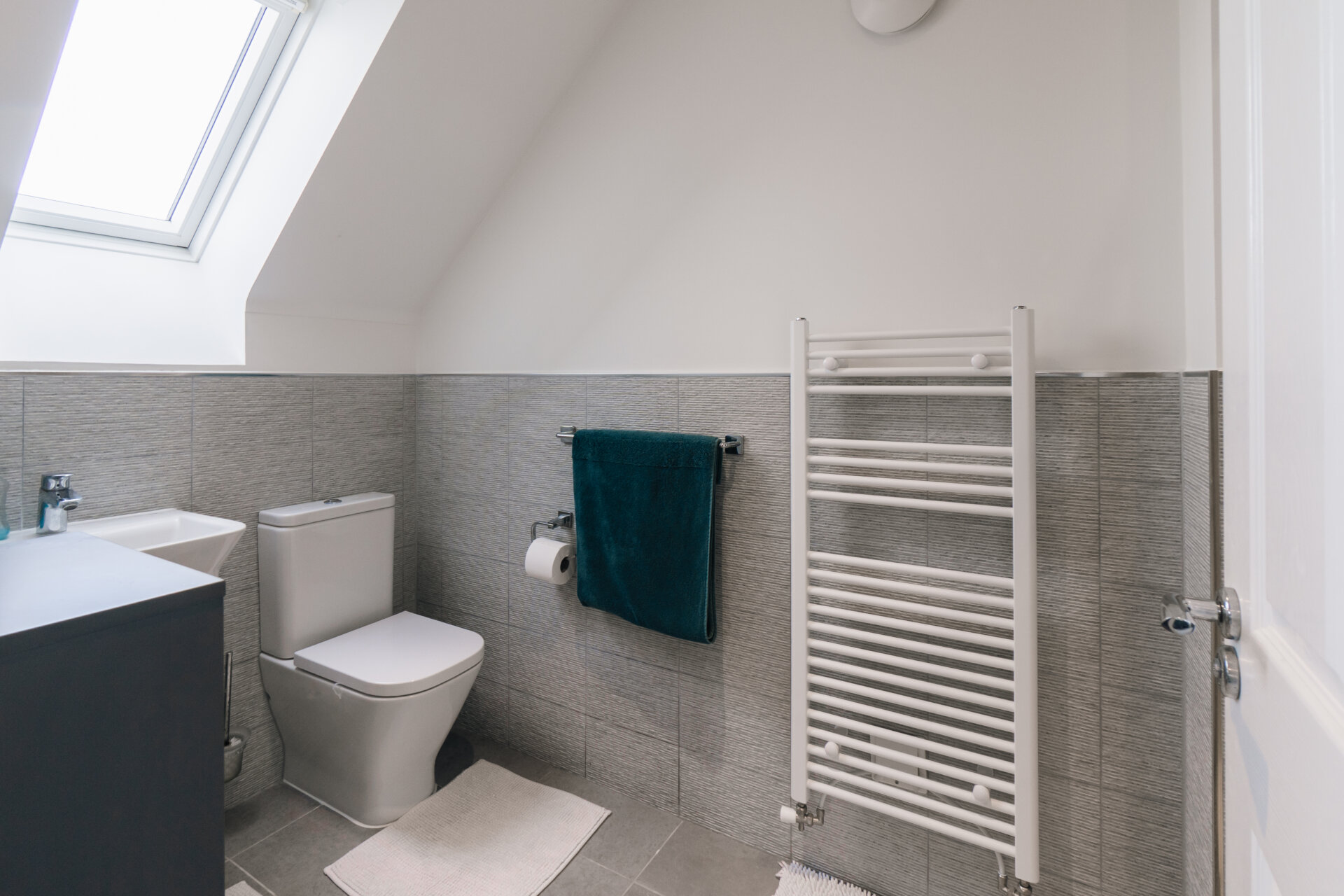 A modern en-suite featuring a sink, toilet, and a large shower.
