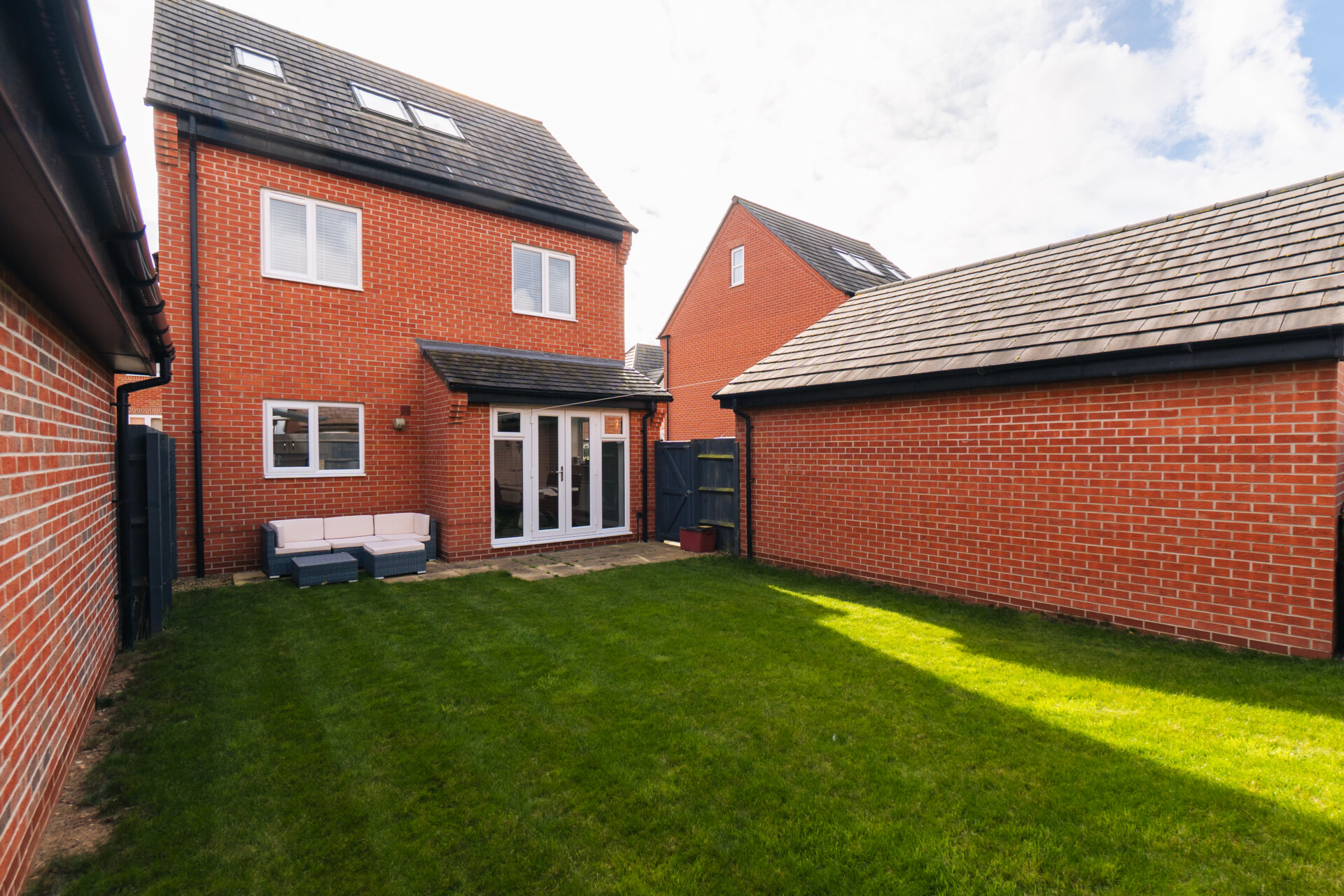 The garden features a well-maintained grass lawn and a patio, perfect for outdoor activities, relaxation, and entertaining guests.