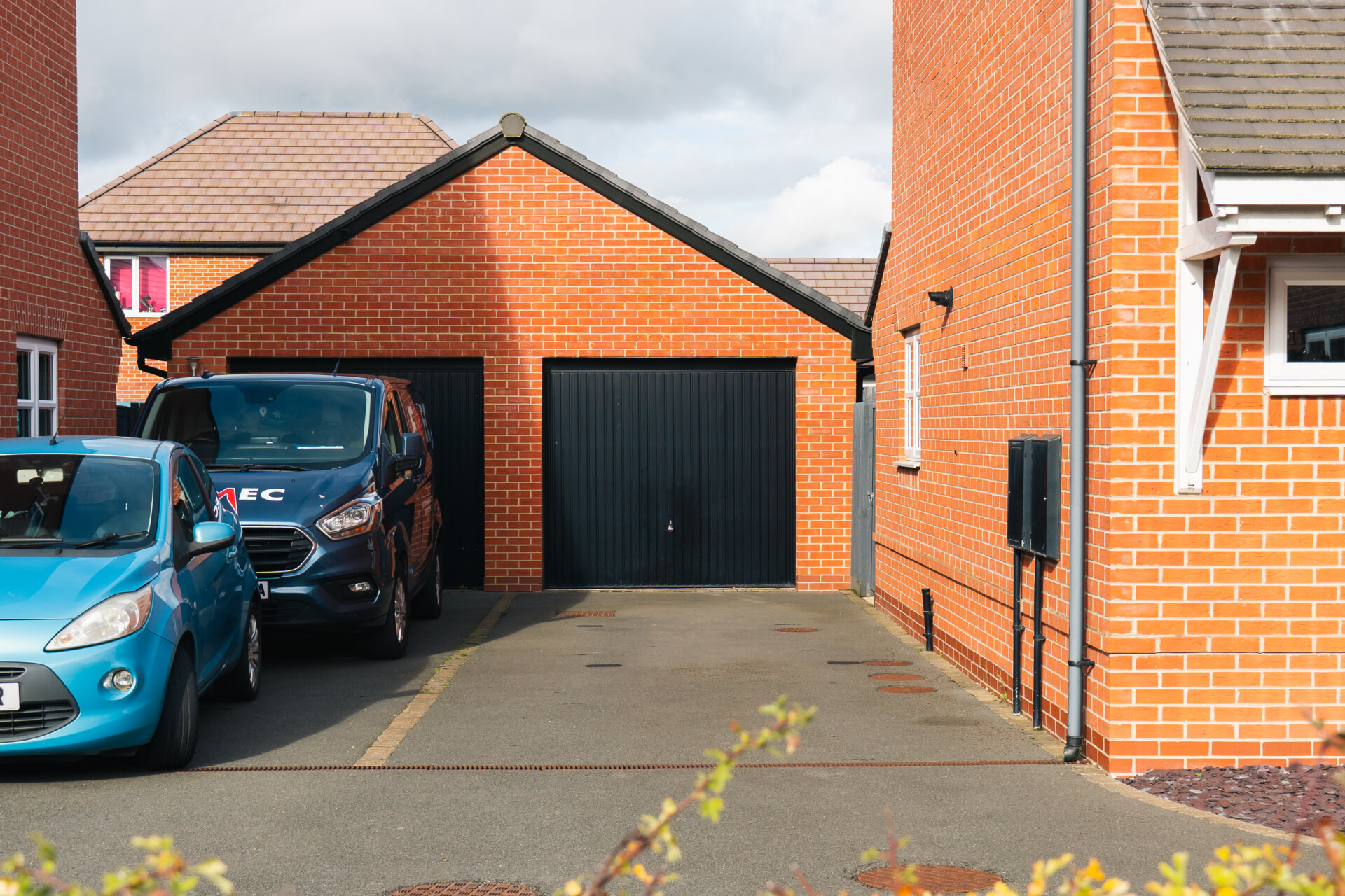 Ample parking space with a large detached garage providing extra storage, currently being used as a home gym. Driveway for two cars.