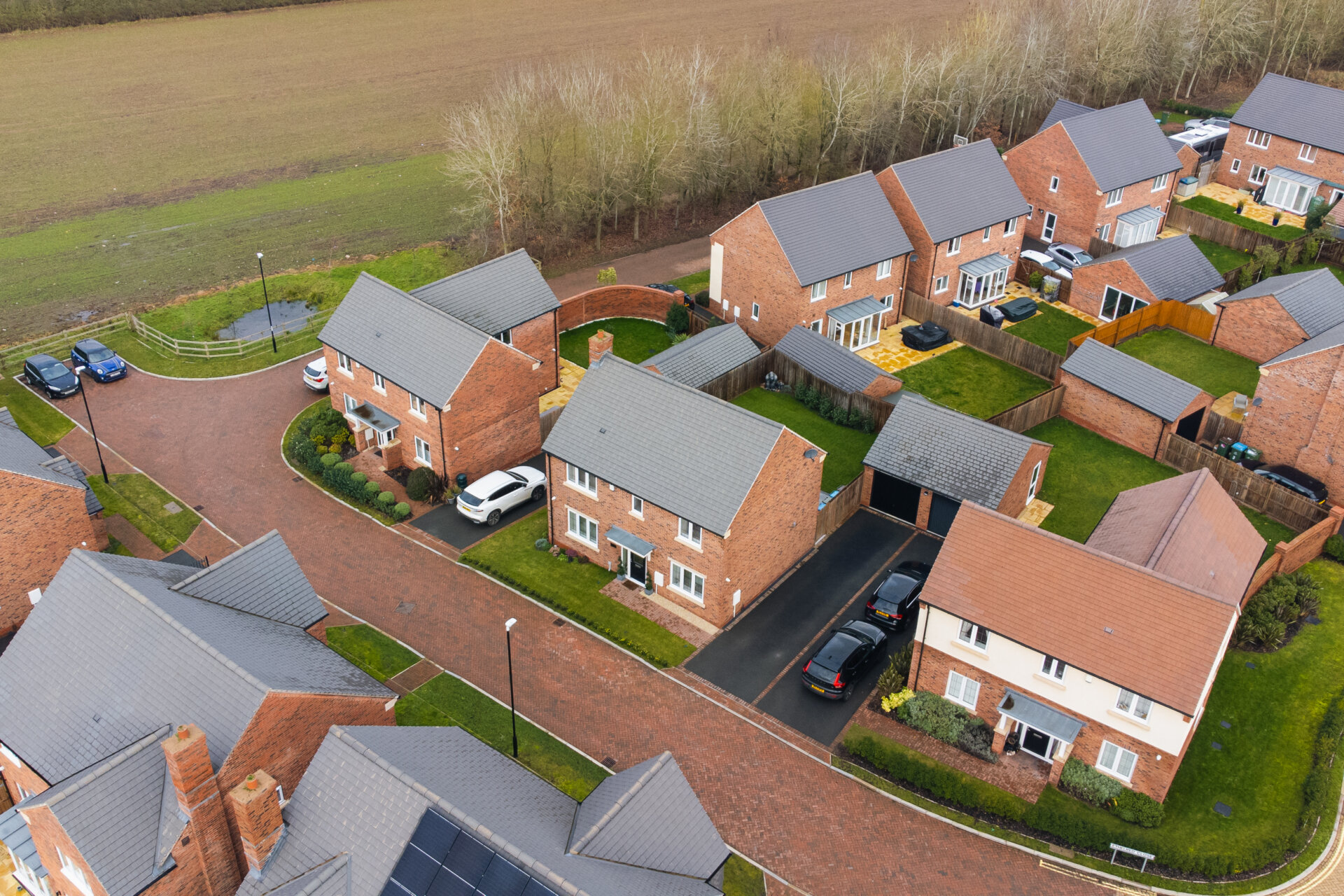 Single garage fitted with an electric up and over door and electric vehicle charging point, complemented by tandem driveway parking for three cars.