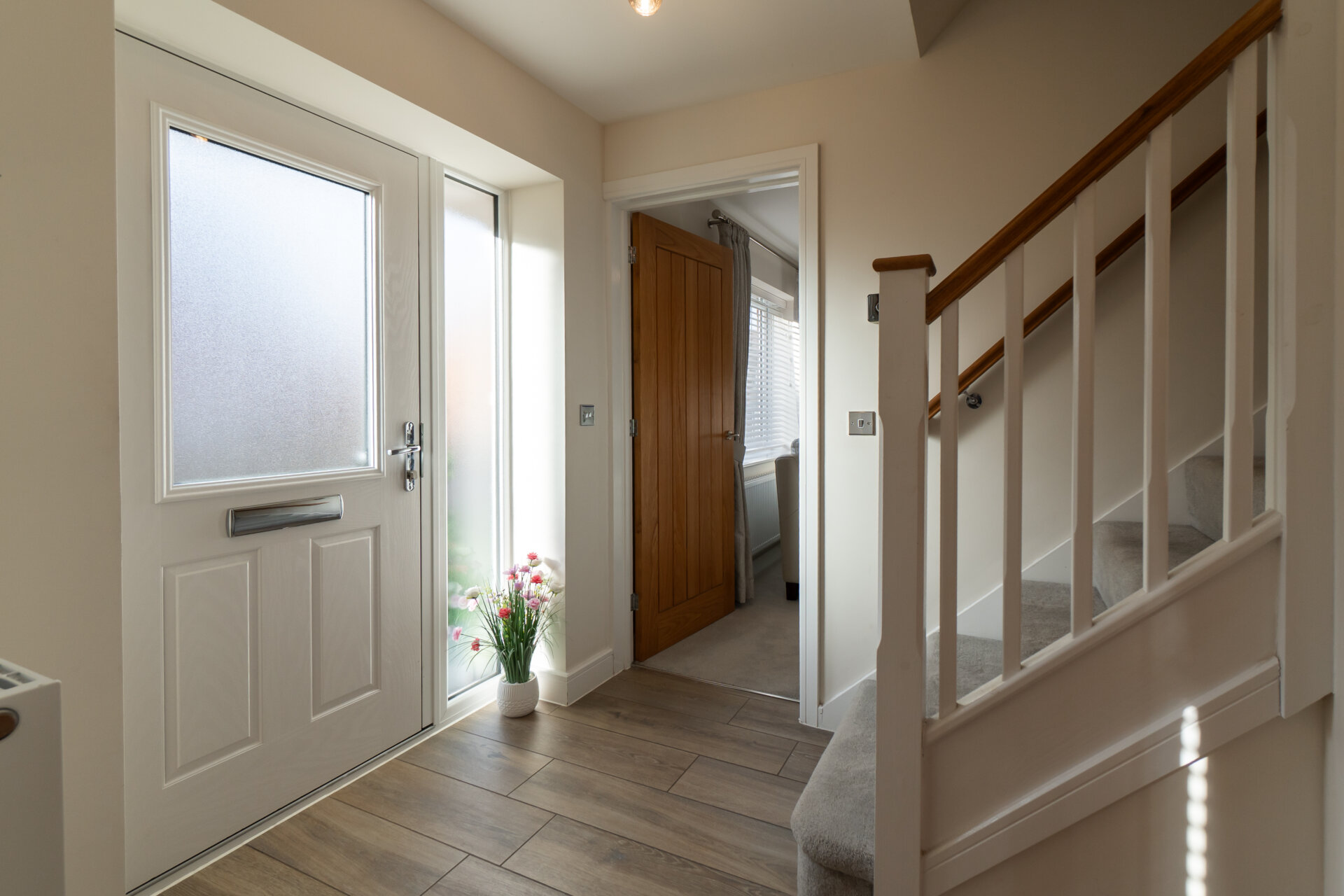 A welcoming entrance hallway featuring high-quality Porcelanosa tiled flooring, a radiator, and a staircase rising to the first floor. Provides access to the front reception room and the kitchen, with oak internal doors continuing throughout the home.
