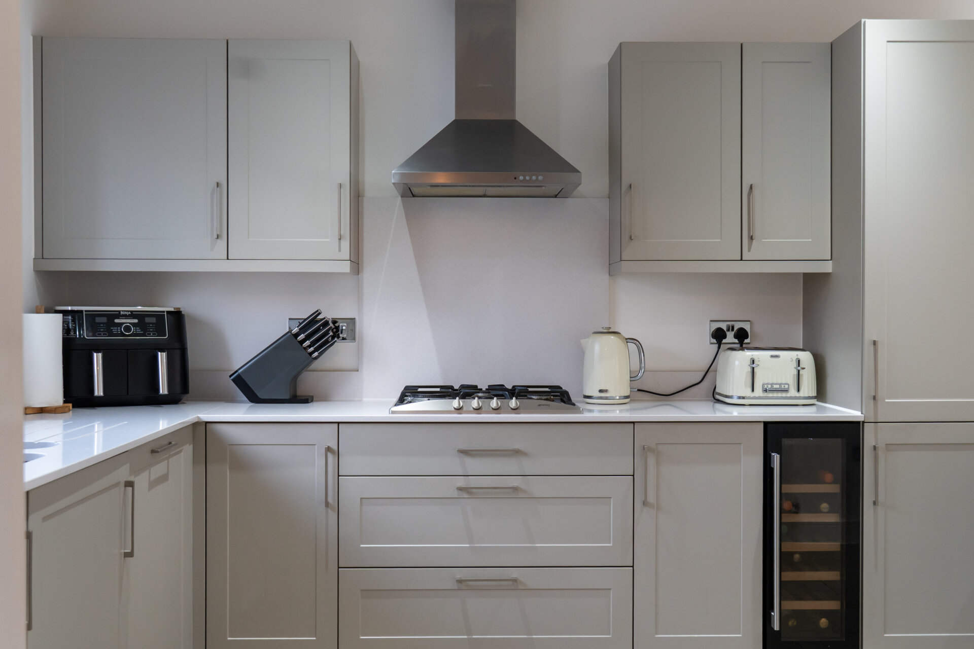 A stylish and contemporary open-plan kitchen/dining space with a range of shaker style wall mounted and base units. Porcelanosa tiled flooring and dual-aspect windows allowing for ample natural light. The kitchen is fitted with white granite worktops, a breakfast bar with seating for three, LED lighting, and fitted blinds. Integrated Smeg appliances include a dishwasher, wine fridge, fridge freezer, double oven, and gas hob, with a radiator also installed.