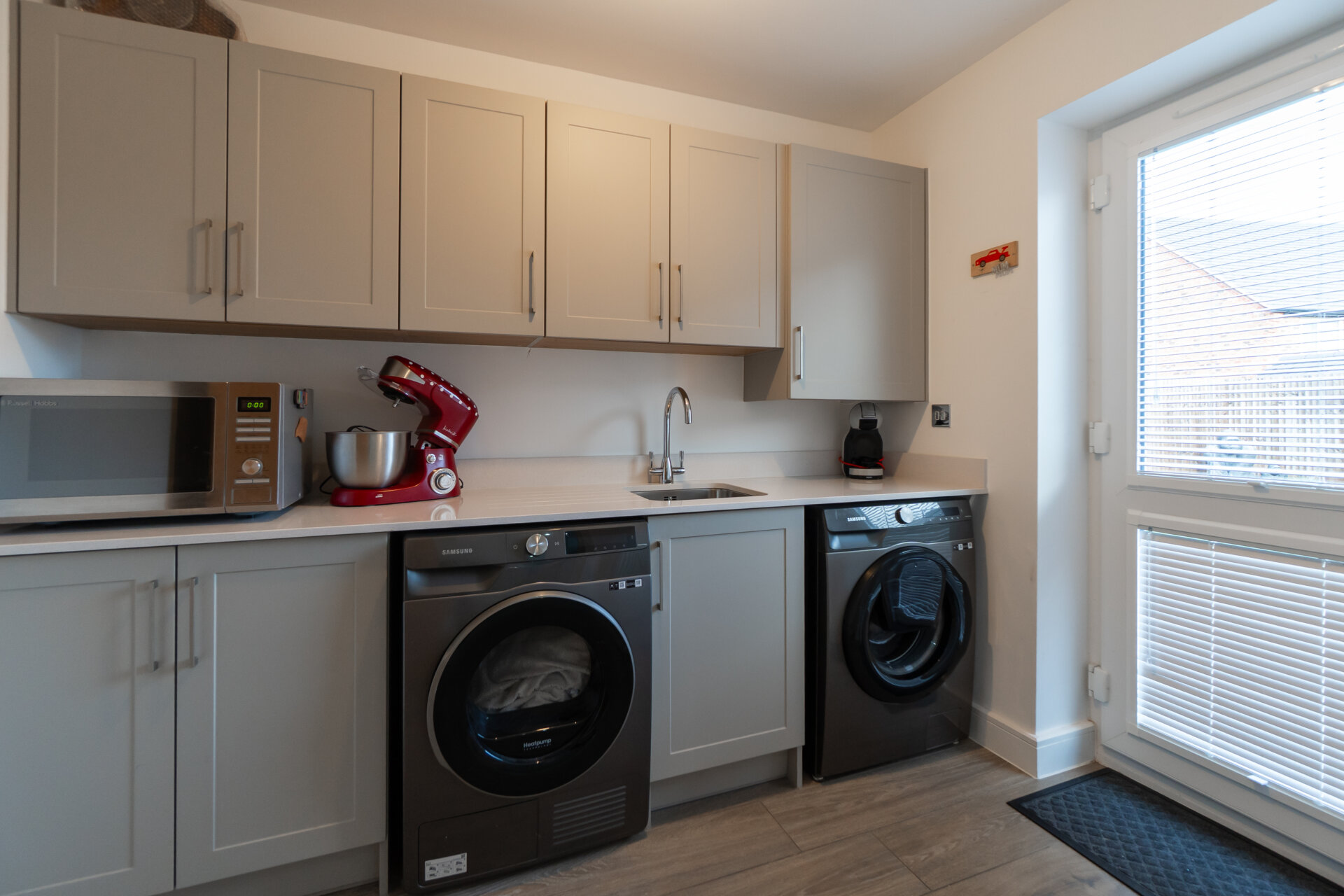 A practical utility area offering overhead storage cabinetry, space and plumbing for a washing machine and tumble dryer, a radiator, and a door leading to the rear garden with fitted blinds. The boiler and immersion heater have been recently serviced.