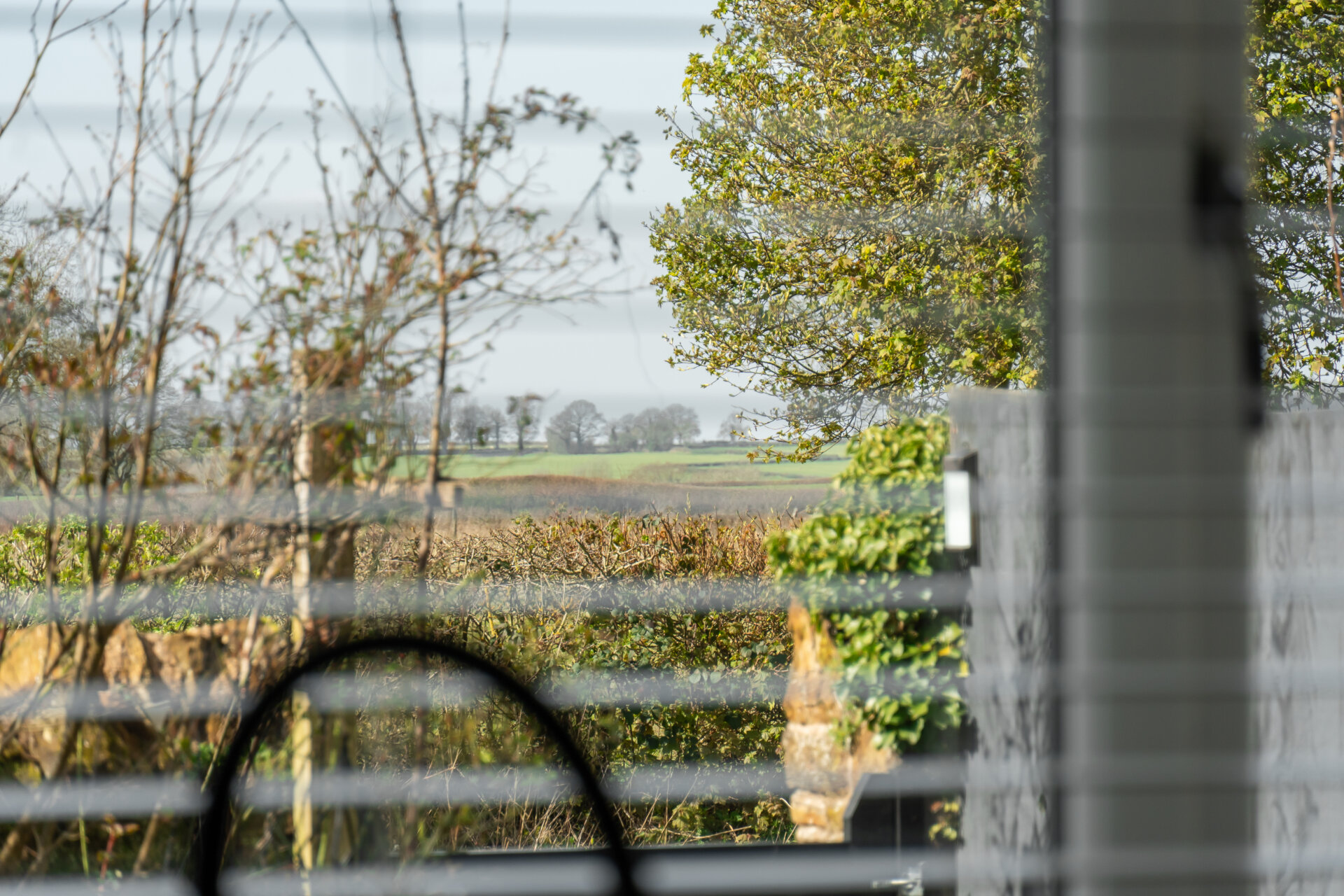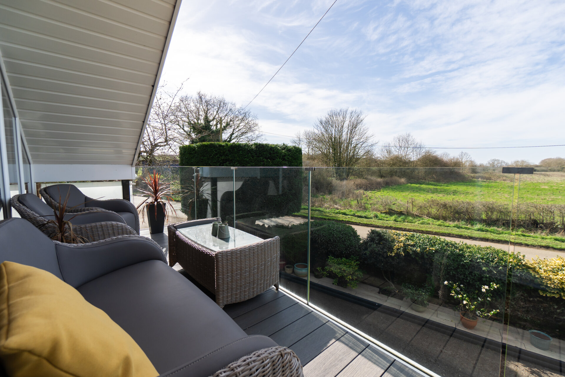 Upstairs, the home takes on a truly unique feel. A beautifully designed sitting room with a vaulted ceiling creates a sense of volume and calm, with large windows framing views across the surrounding countryside. Doors open onto a private balcony — an ideal spot for morning coffee or unwinding in the evening.