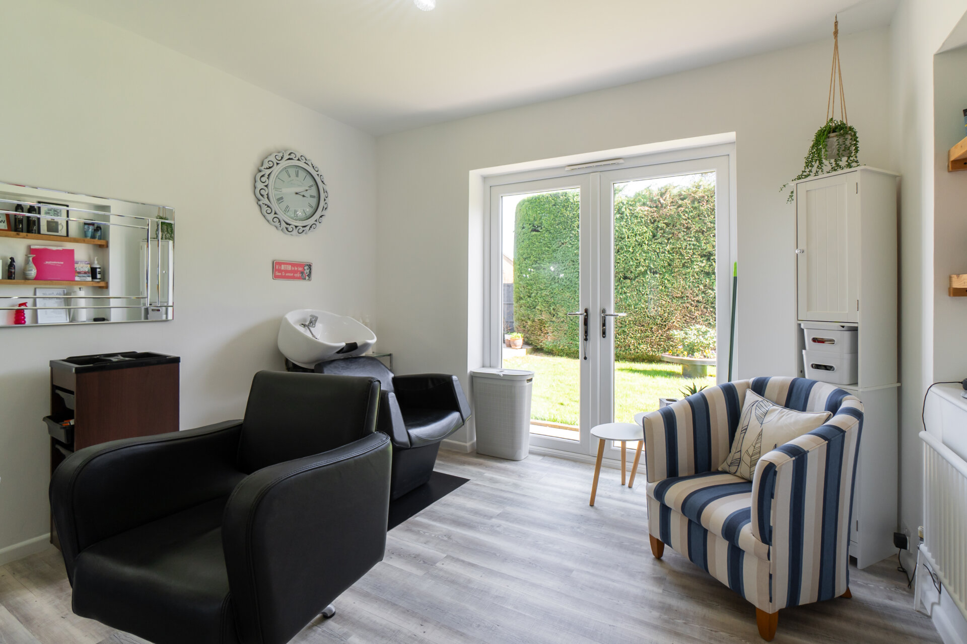 The ground floor offers exceptional flexibility, with three well-proportioned double bedrooms. Two of these are currently styled as a salon and a gym, both enjoying direct outlooks onto the garden, demonstrating how adaptable the accommodation can be. A stylish family bathroom serves this floor.