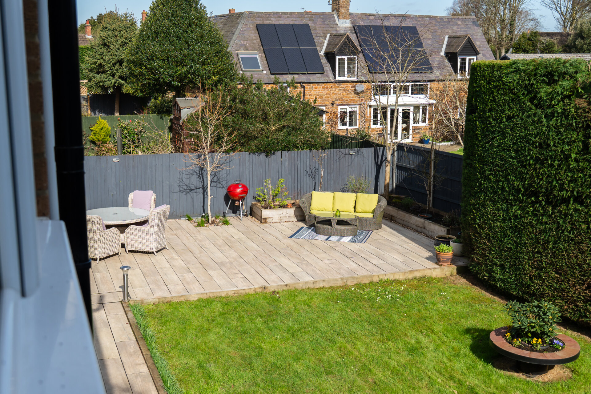 Externally, the garden has been thoughtfully designed to offer both privacy and enjoyment. Enclosed by mature hedging and framed by trees, it captures sunlight throughout the day. A large patio area with wood-effect tiling provides the perfect setting for outdoor dining and entertaining.