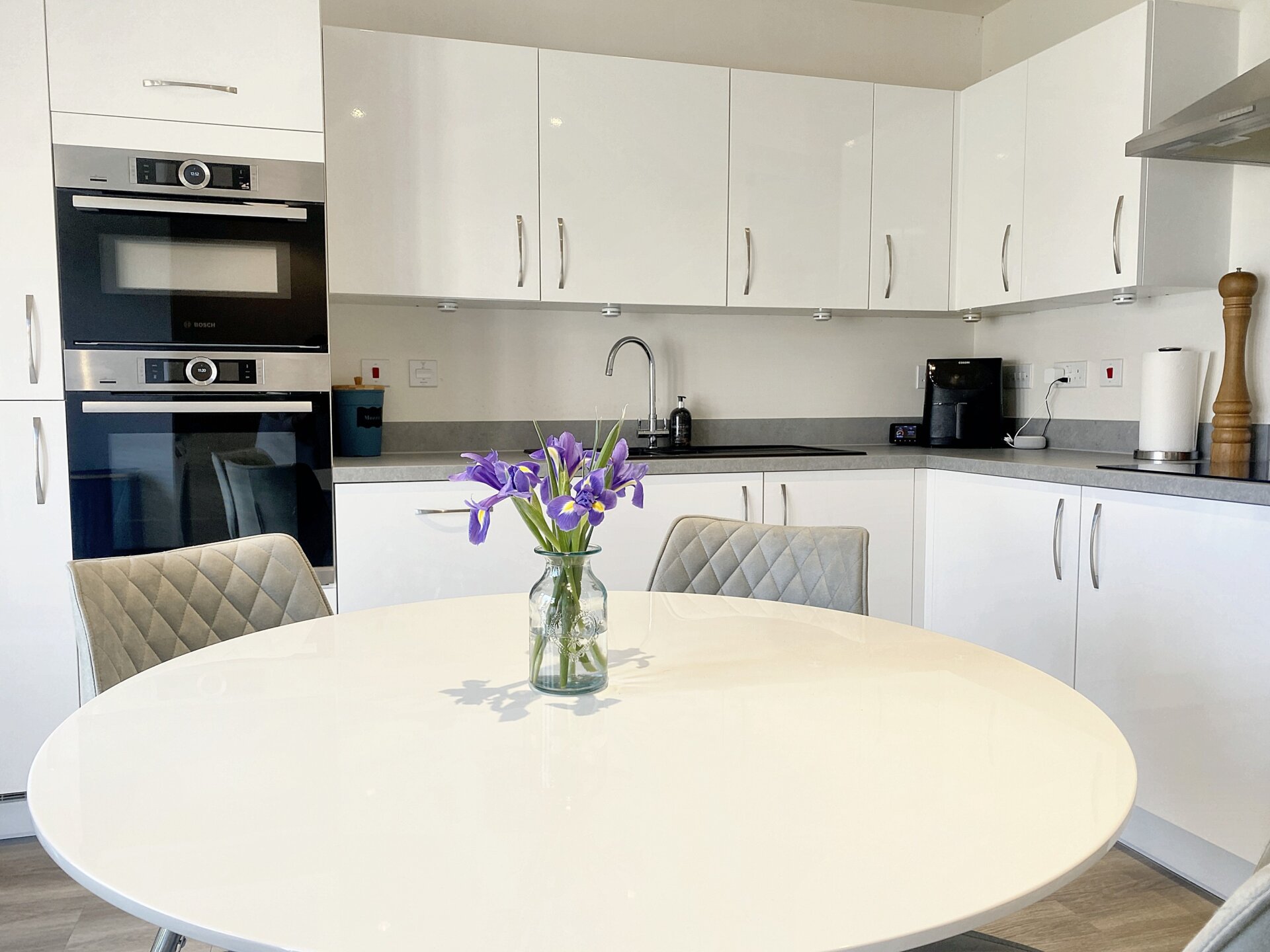 A modern high gloss kitchen in a range of base, wall and tall units, with L-shape design offering a generous and versatile space for dining. This high-spec kitchen enjoys BOSCH integral appliances, including, double electric fan oven with integrated microwave (both with wifi control from your smart phone), dishwasher, ceramic four ring electric hob, larder fridge/freezer, chimney extract. Contemporary laminate worktops with matching up-stands, inset composite one and half bowl and drainer with chrome modern mixer tap over. Inset LED spotlights, Amtico flooring and French doors leading and offering views over the garden.