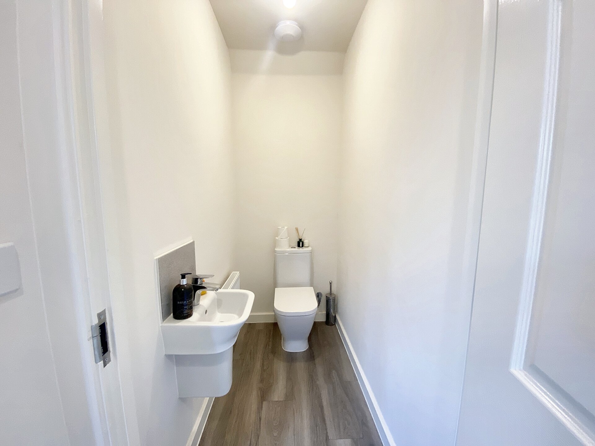 Having modern white two piece suite comprising; close coupled WC and floating wall mounted wash hand basin with complimentary ceramic tiled splash backs, Amtico flooring, ceiling extractor fan and radiator.