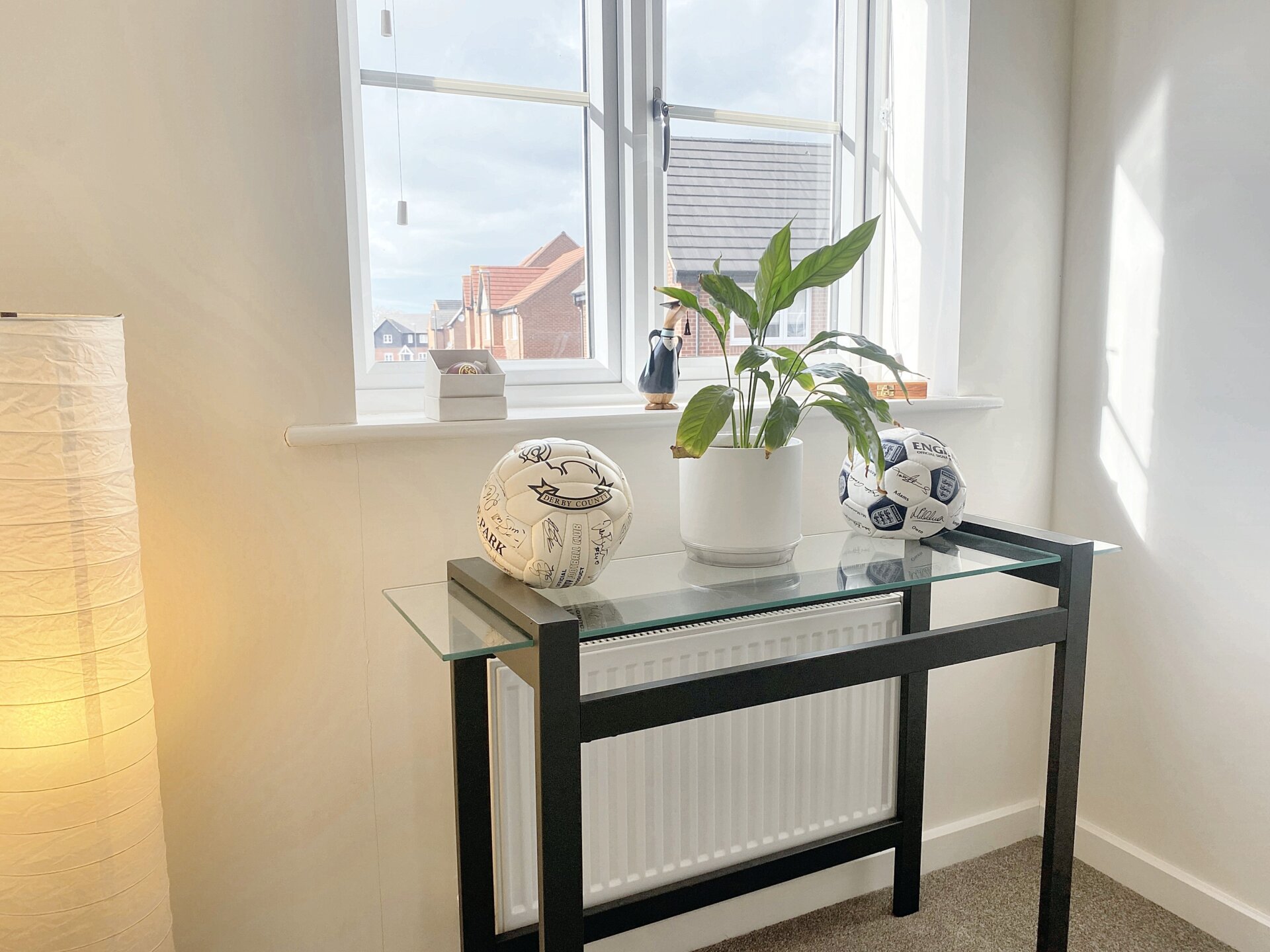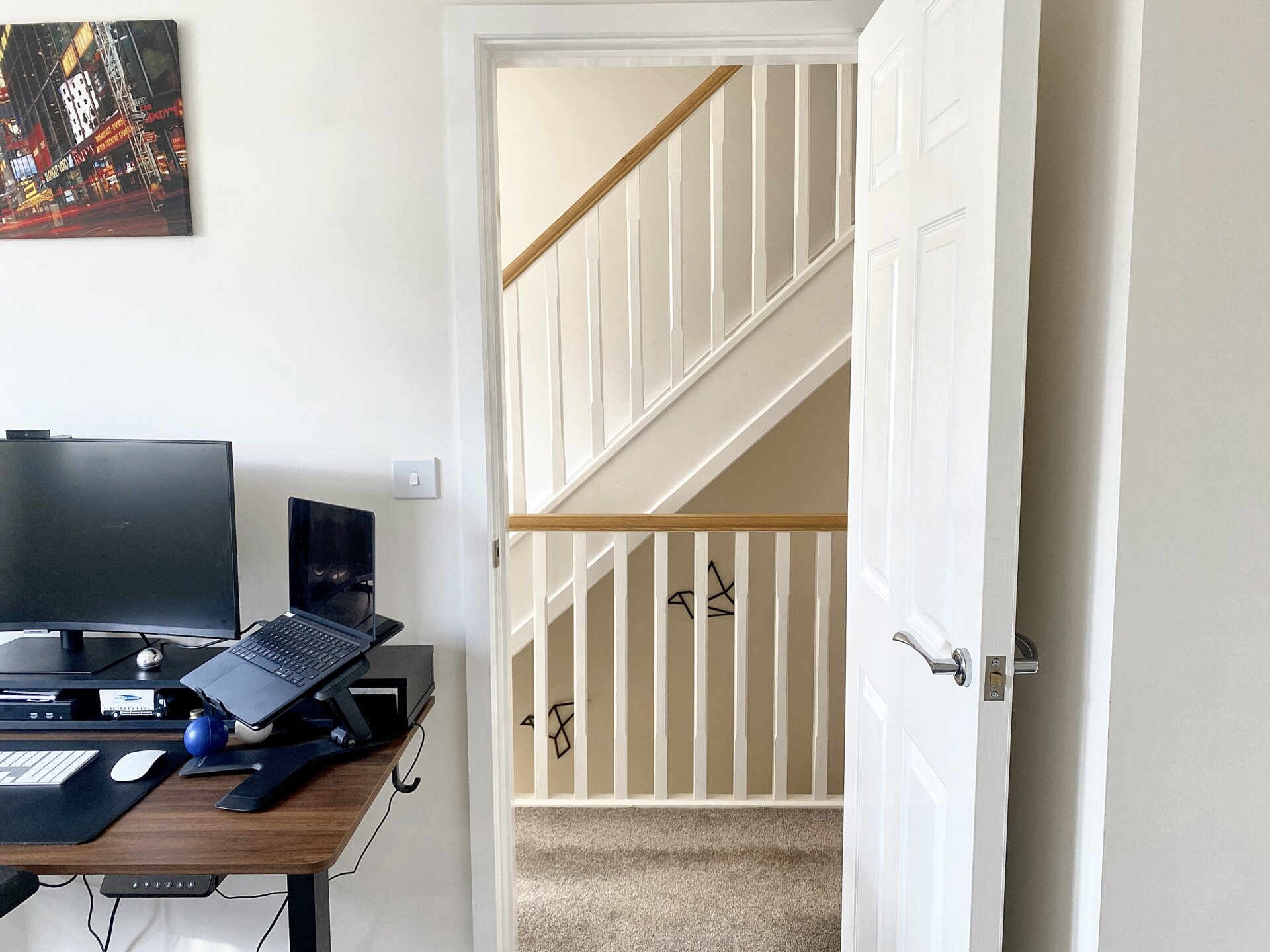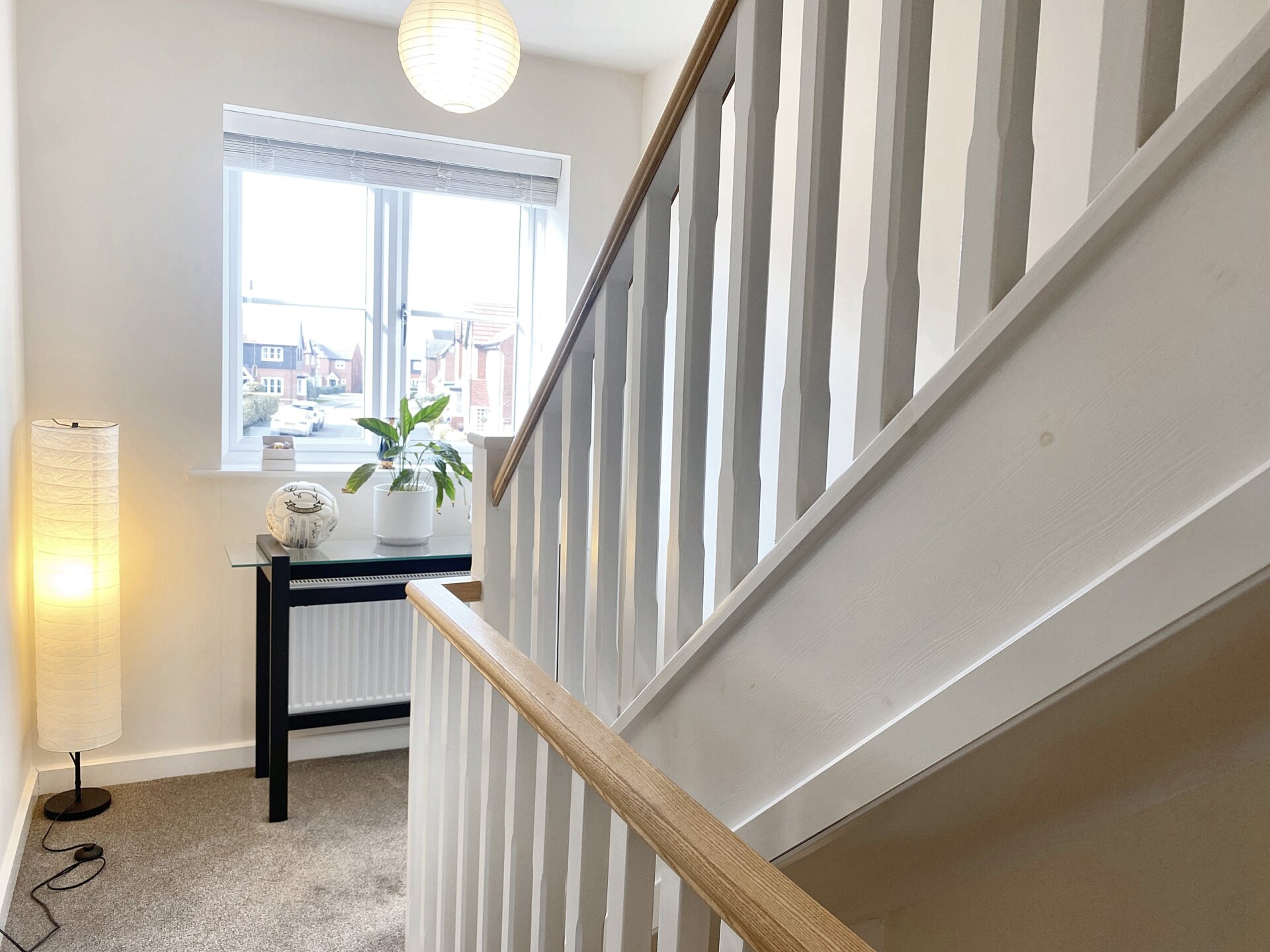 Spacious and bright landing. With natural daylight from the front elevation window, this larger than average landing promotes a neutral design with fresh white balustrade and exposed wood handrail, and leads you to the family bathroom, two double bedrooms, storage cupboard housing the hot water tank, and second floor staircase.