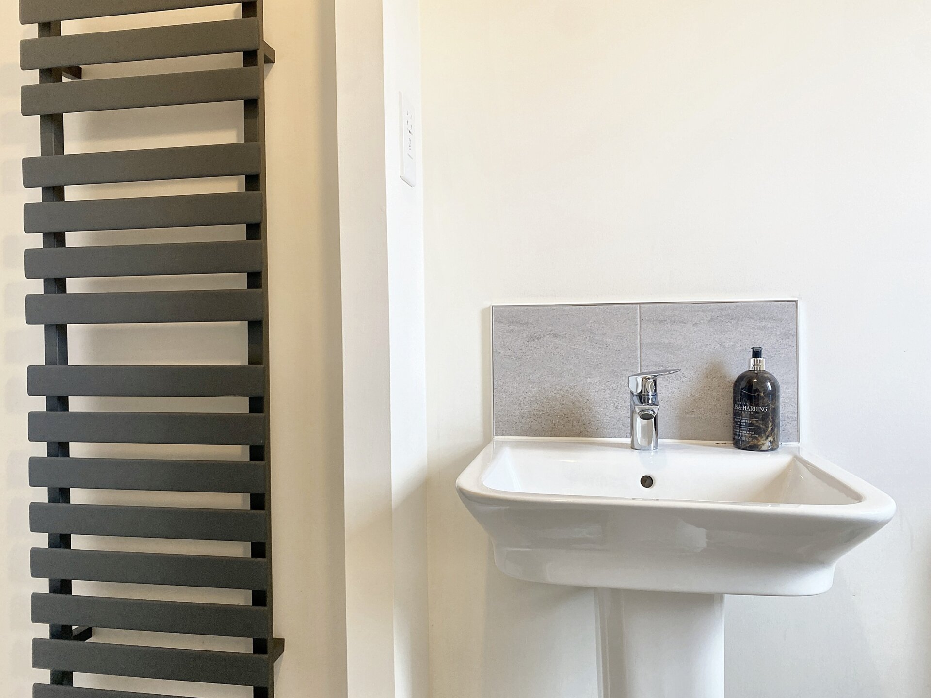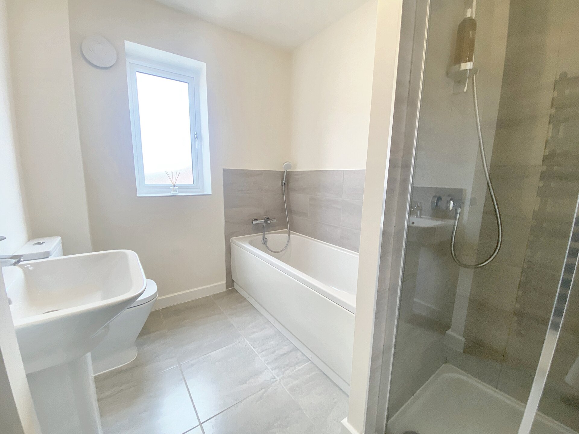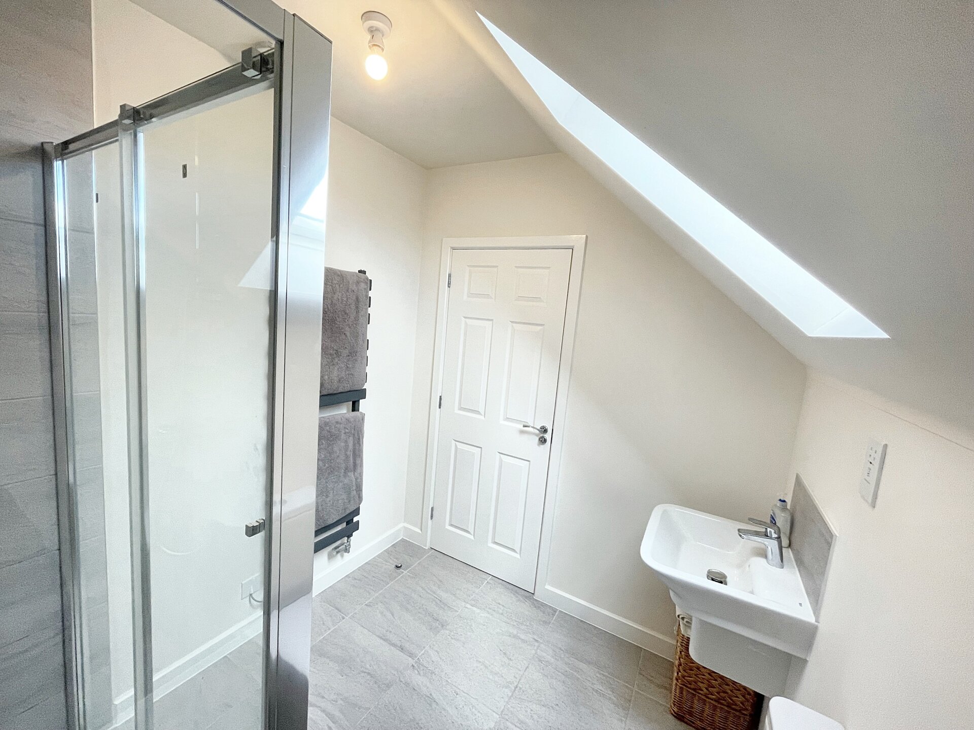 With three piece suite, ceramic tiled flooring, splash back and fully tiled double shower enclosure. With Anthracite heated towel radiator, pedestal wash hand basin with chrome mixer, close coupled WC and chrome thermostatic shower. Velux window to the rear elevation.