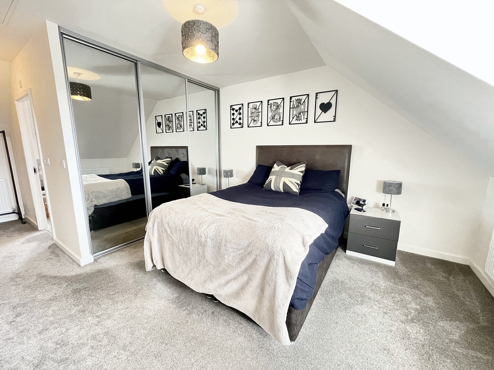 A double bedroom with inset wall space for wardrobes, luxury carpet, radiator and window to the rear elevation.