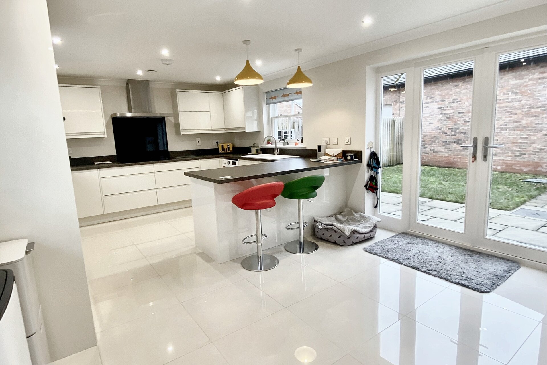 This modern, generously sized lounge exumes warmth and style, centred around a stunning multi-fuel log burner, complete with a charming timber mantle and an elegant marble style hearth. The room benefits from unspoilt walls, thanks to the discrete underfloor heating, allowing for a sleek and uncluttered look. Inset spotlights enhance the contemporary style. A double glazed sash window sits to the front elevation. At the rear, French doors with equal height window panels offers views of the garden, flooding the space with natural light.