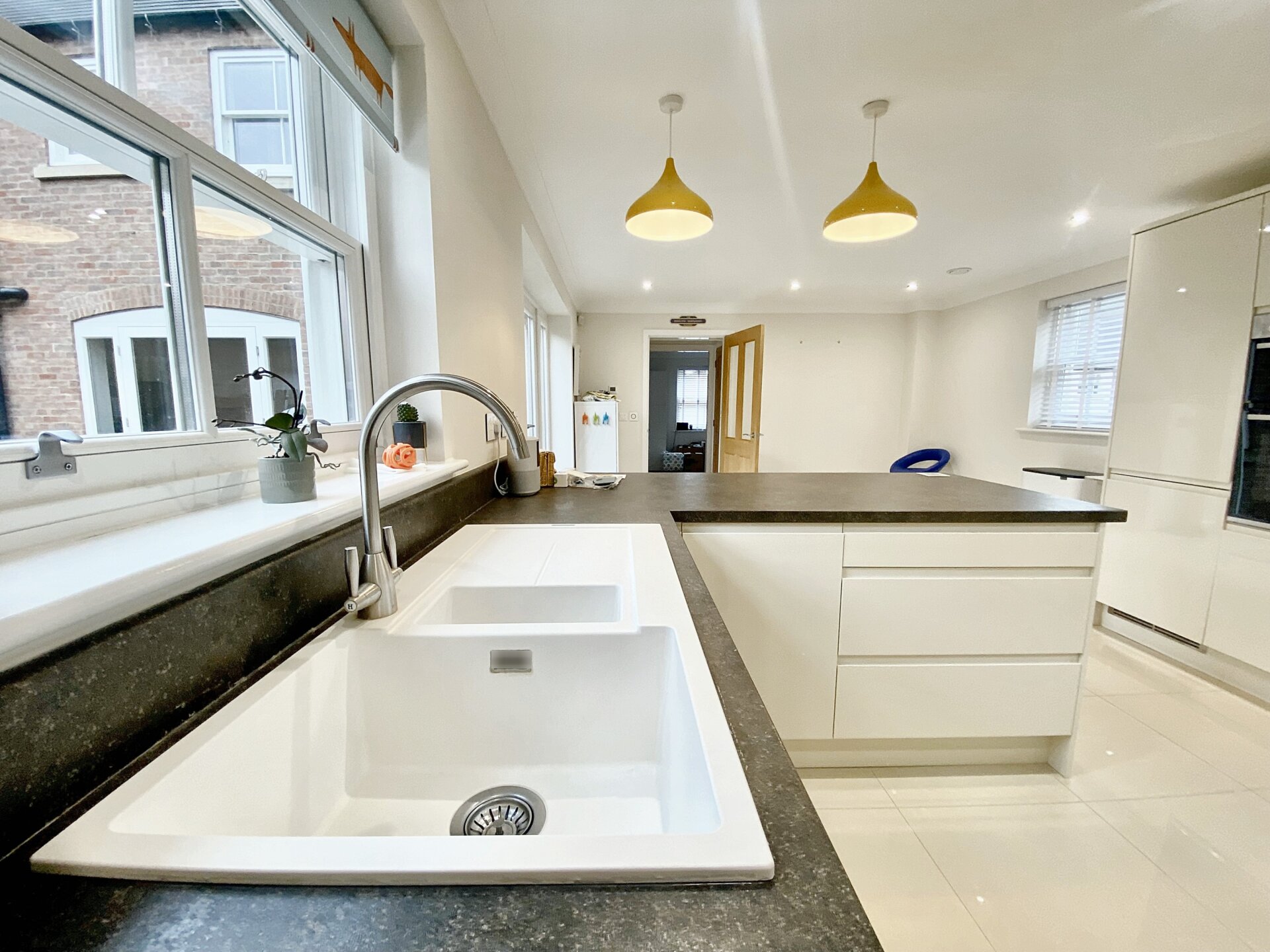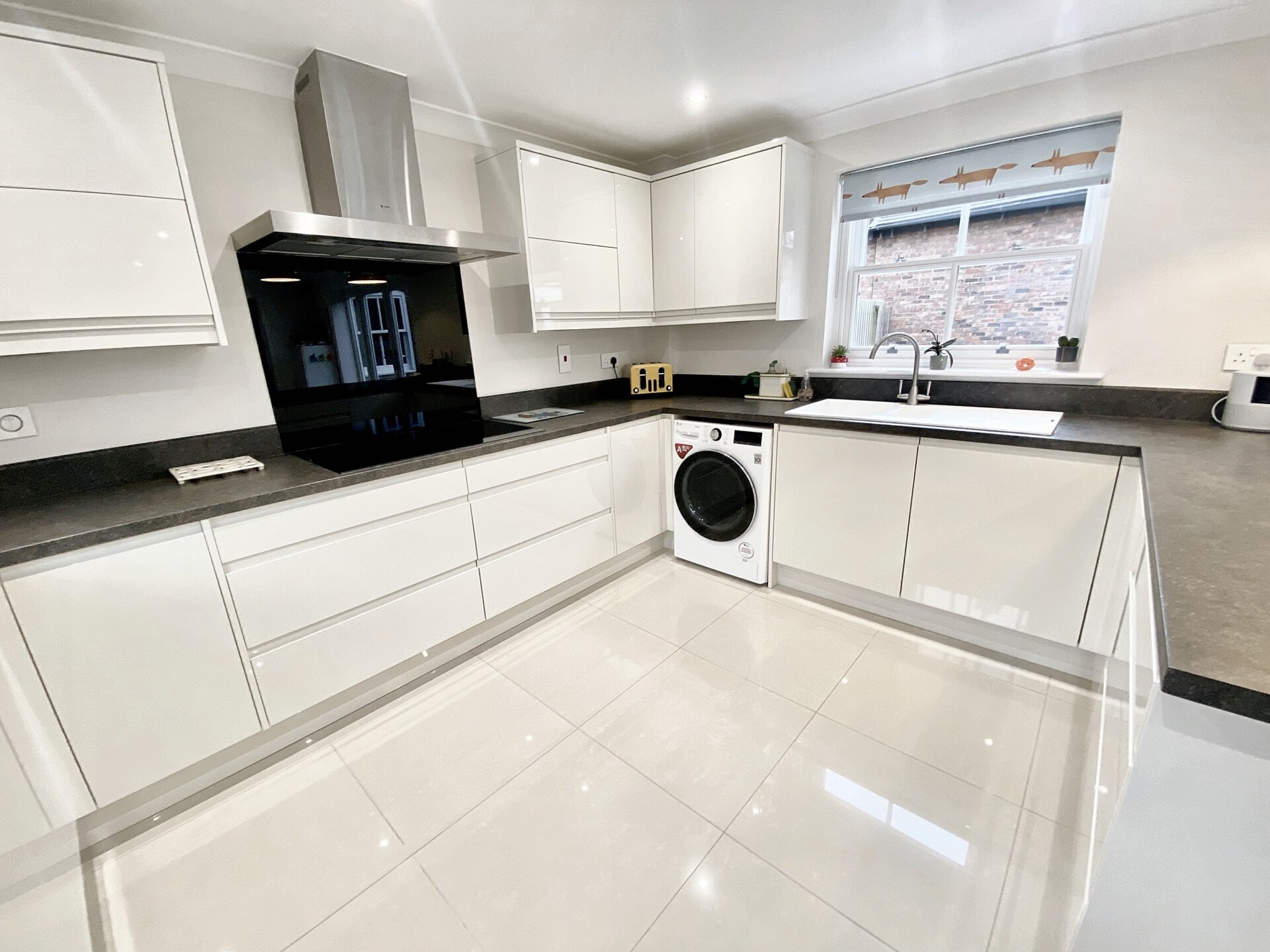Appointed with premium finishes, including laminate worktops and matching upstands, complemented by a suite of integrated appliances: a double electric waist-height oven (Bosch), induction hob with chimney extractor, integrated fridge freezer, dishwasher and dedicated space for a washing machine. A one-and-a-half sink and drainer, fitted with a swan neck mixer tap.