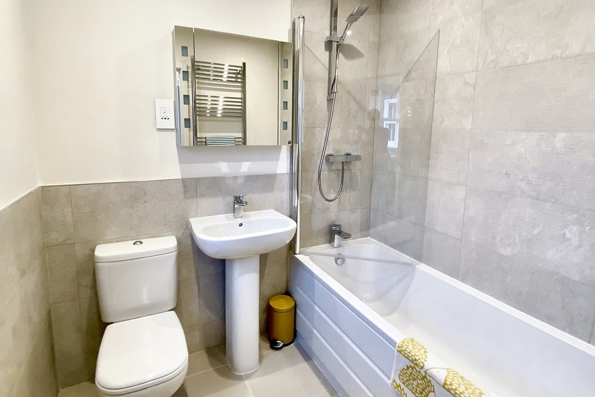 A modern and elegant bathroom located to the side and rear elevation of the property, with double glazed sash window to the rear. The bathroom is light and spacious with additional features of shaving socket, illuminated mirror, chrome heated towel radiator and inset spotlights. This fresh bathroom offers a white modern three piece suite with pedestal wash hand basin, low level wc, panelled bath with shower over and glazed shower screen. Neutral ceramic tiled floors and part tiled walls.