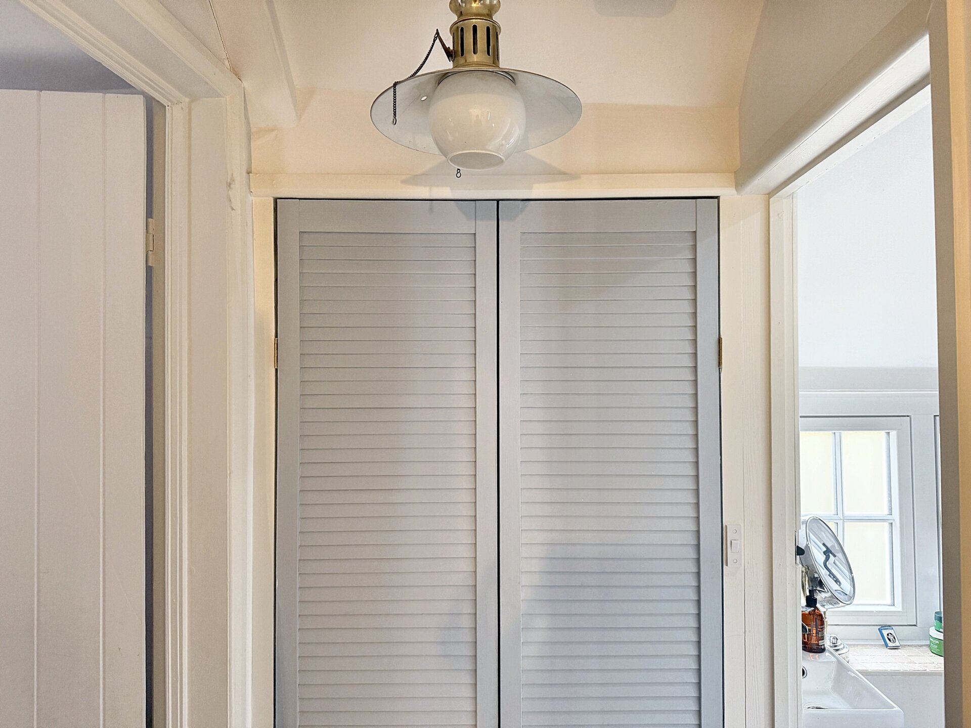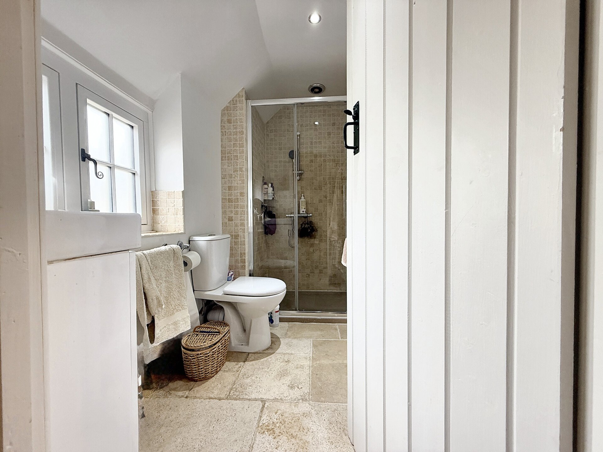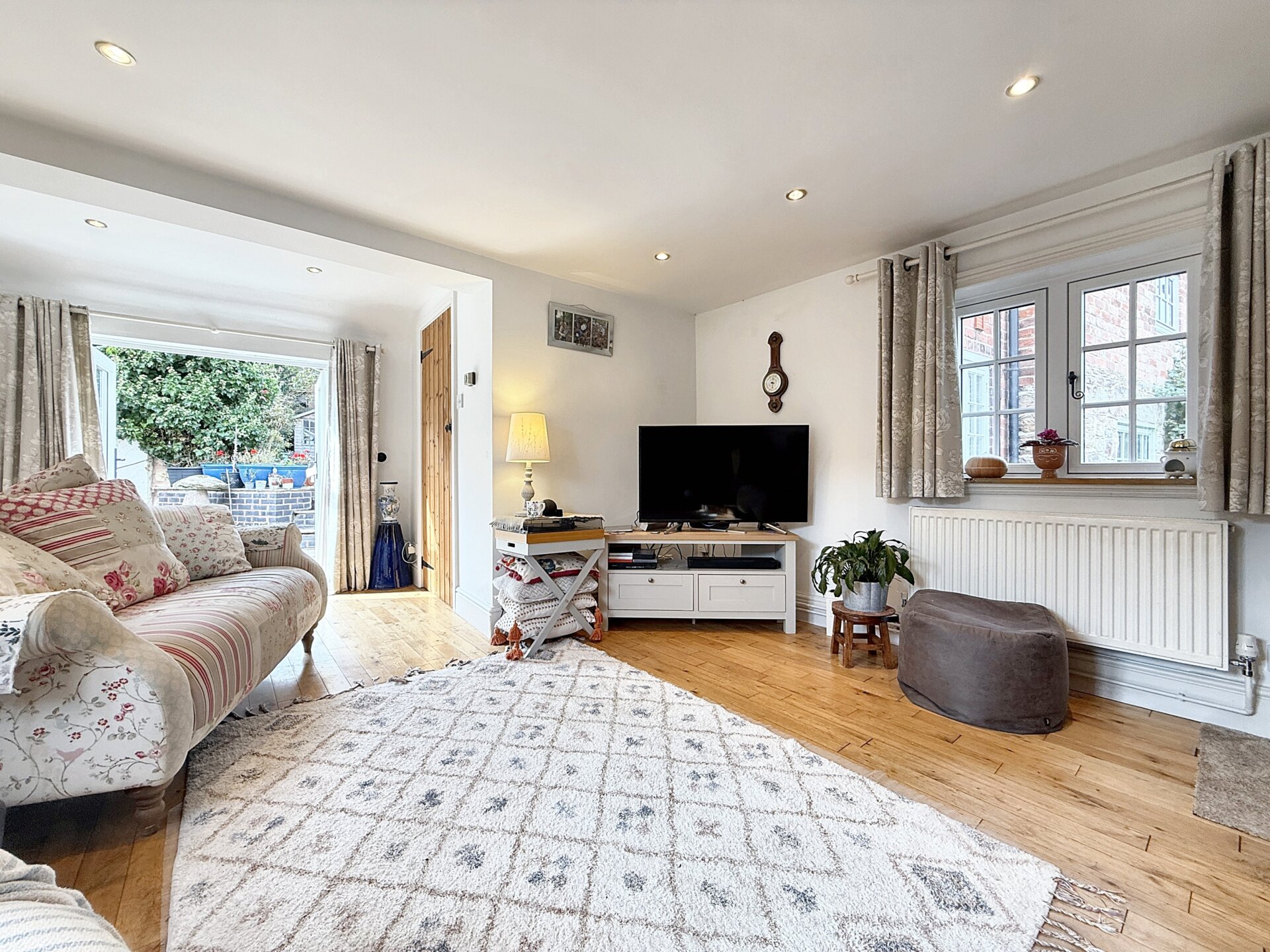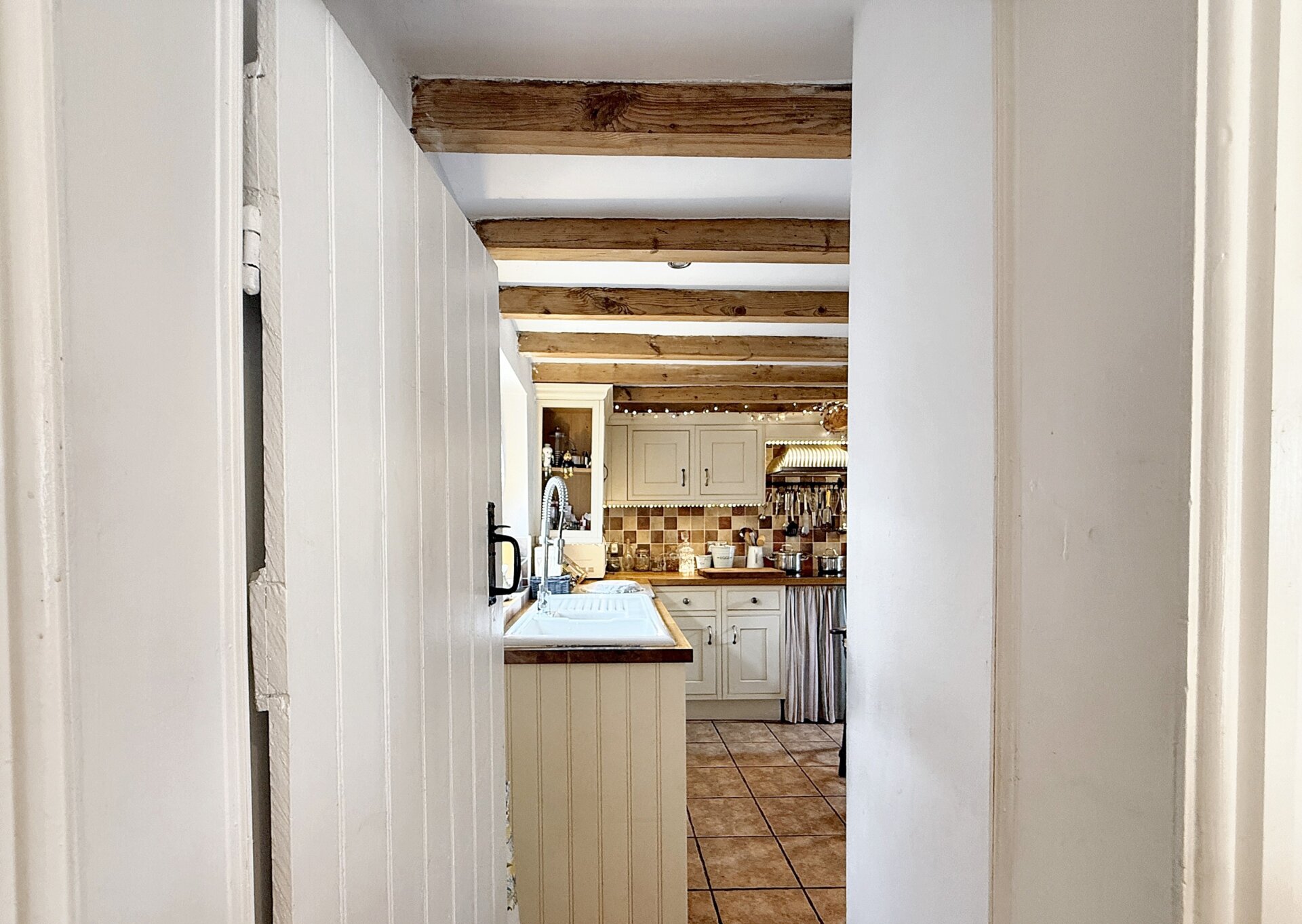 The cottage lounge is a bright and welcoming space, finished with whitewashed walls and inset modern spotlights. Dual-aspect windows and French doors open directly into the cottage garden & patio. A rustic exposed brick chimney with log-burning multi fuel stove forms the main focal point of the room, adding both character and warmth. Oak flooring complements the setting, with a radiator providing further comfort. From here, the room leads conveniently to the garden, downstairs cloakroom, storage cupboard, and kitchen.