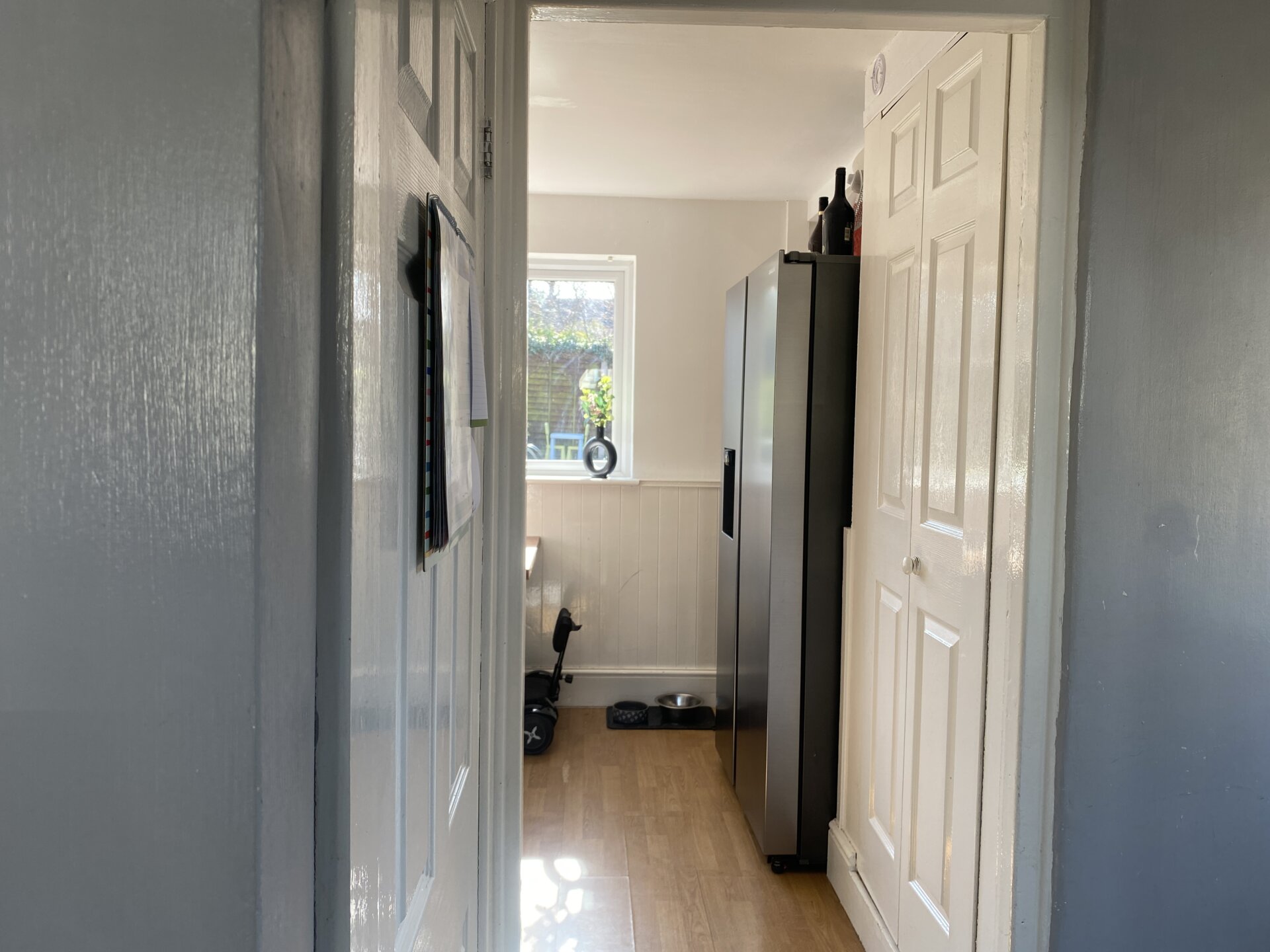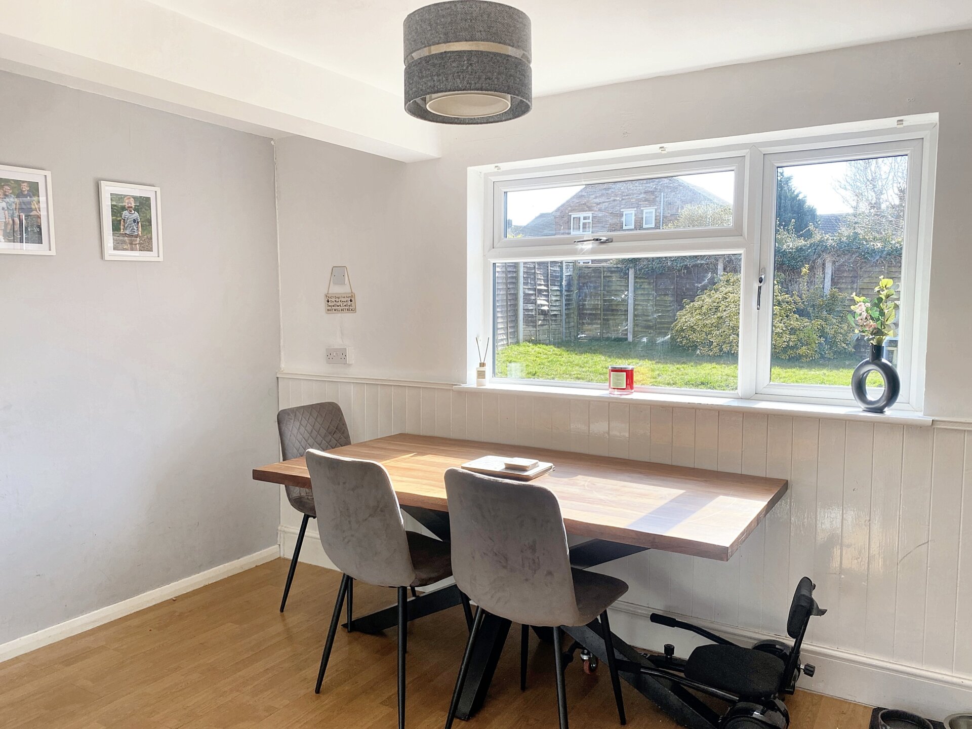 A light and spacious dining room decorated with neutral tones and offers a decorative panelling to the window wall. The window to the rear elevation enjoys views over the back garden. The dining room leads to a side entrance door, useful under-stairs storage cupboard and fitted kitchen.