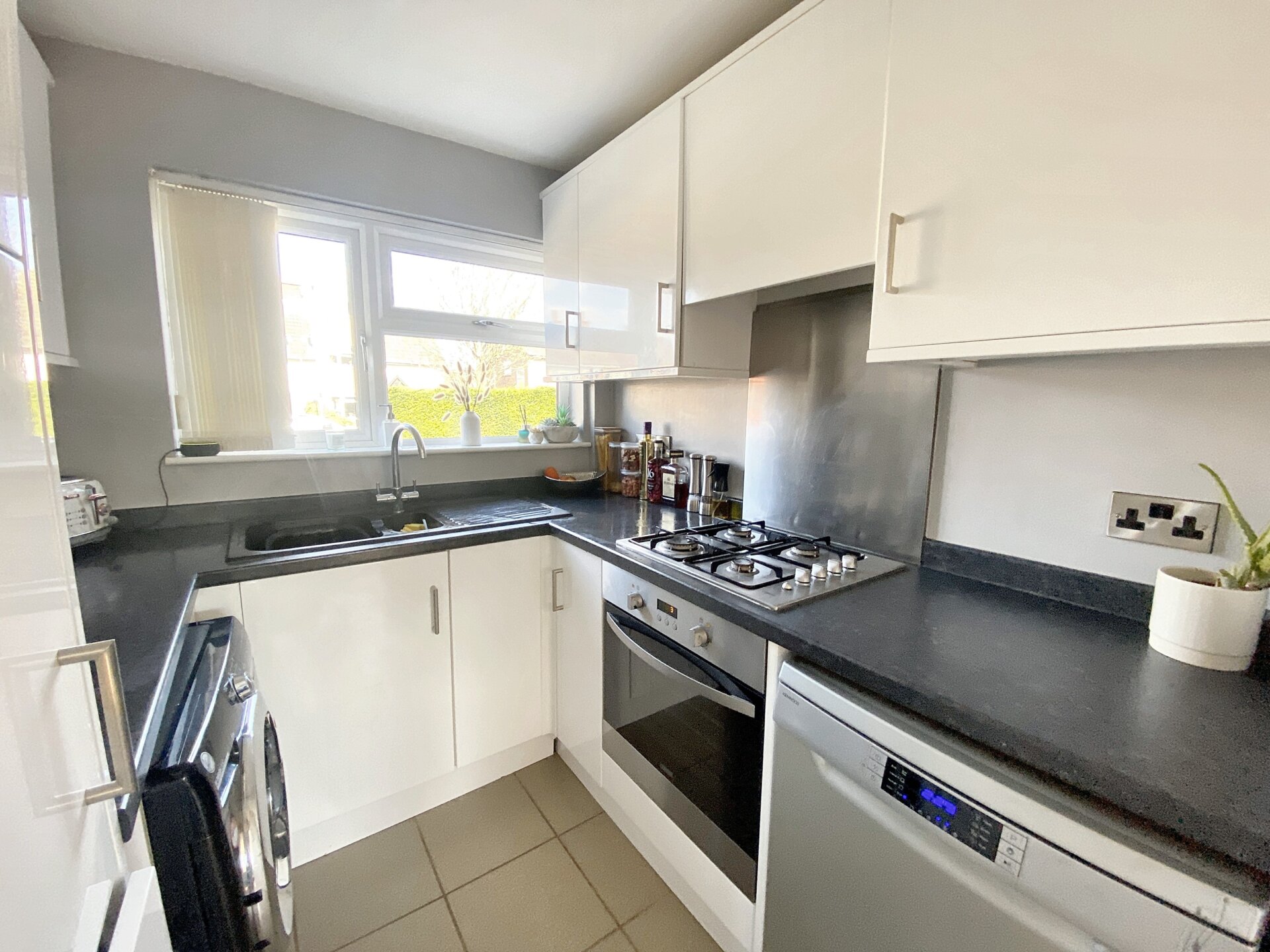 A thoughtfully designed fitted high gloss kitchen, with a range of base, wall and tall units, with laminate worktop & matching upstands, inset sink and drainer with stainless steel mixer tap over. Four ring gas hob with extractor hood and fan over & matching back-splash. Under counter oven. Plumbing and space for washing machine & space for other white goods. Window to the front elevation.