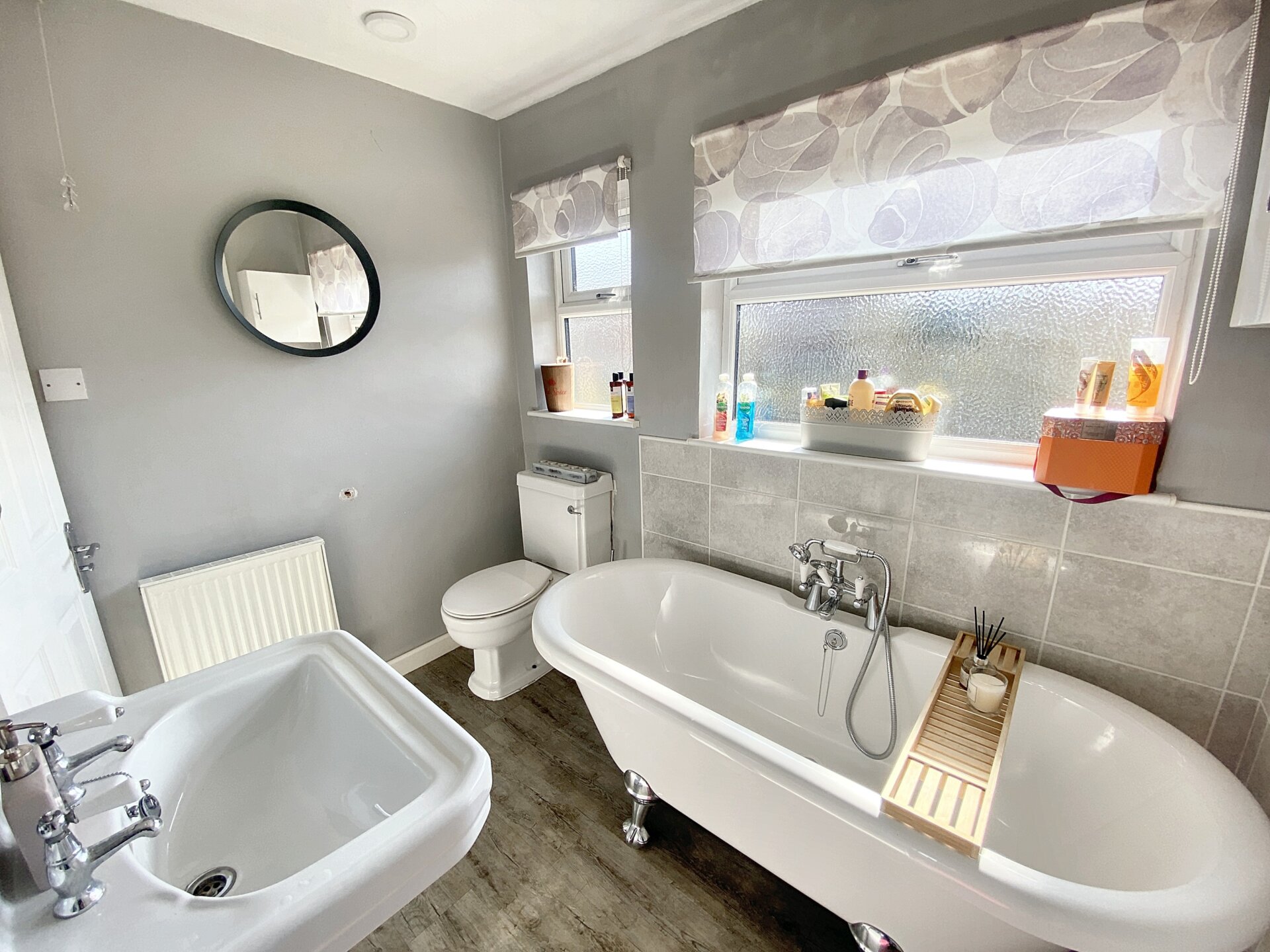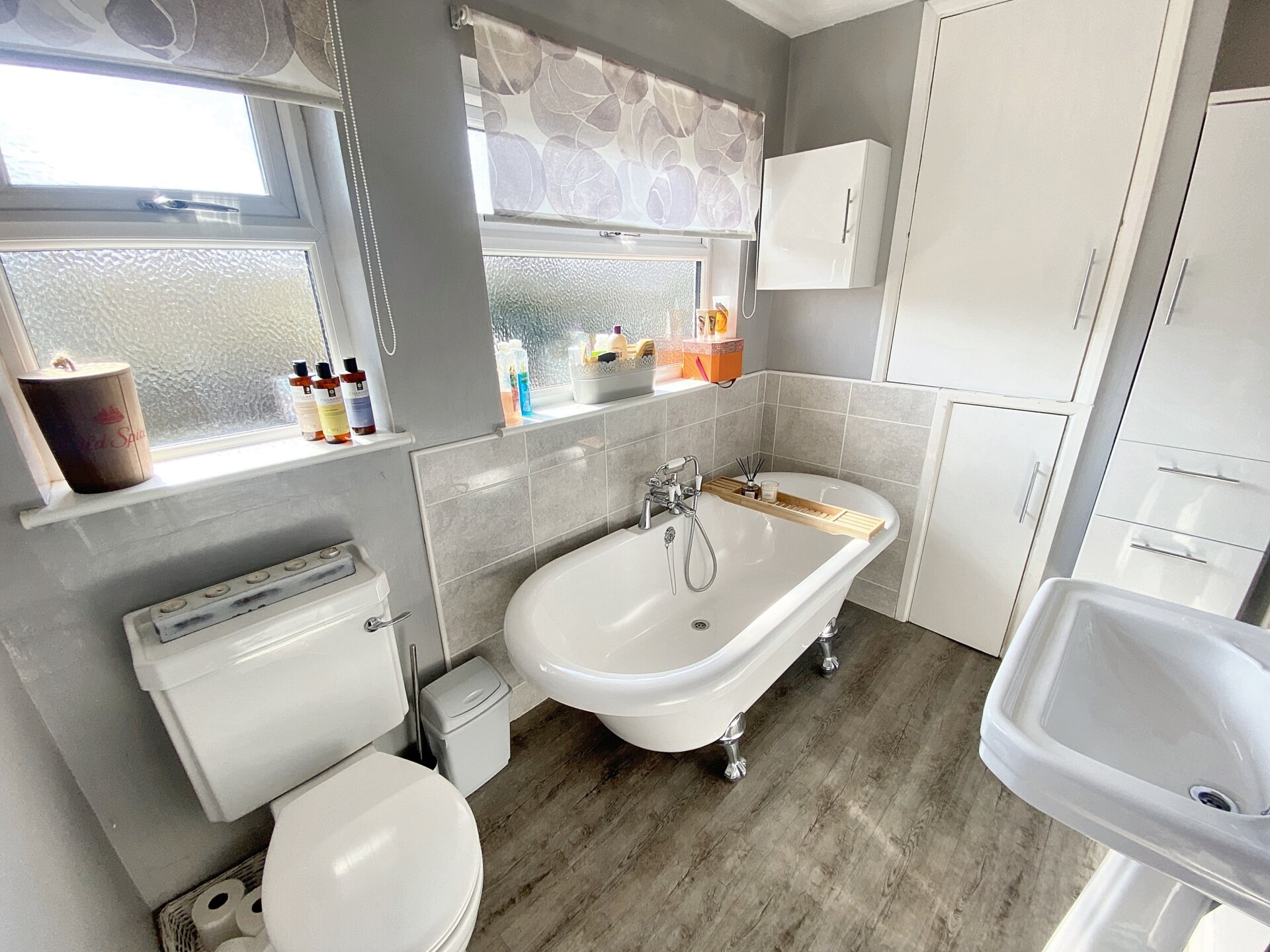 This large bathroom offers lots of natural light with three windows, two to the rear elevation and one to the side elevation. Boasting a roll-top free standing bath with chrome mixer tap and hand held shower. Fully tiled walk in shower enclosure with chrome thermostatic shower and glazed sliding door. Pedestal wash hand basin, low level wc and radiator. With ample built in storage cupboards also housing the boiler.