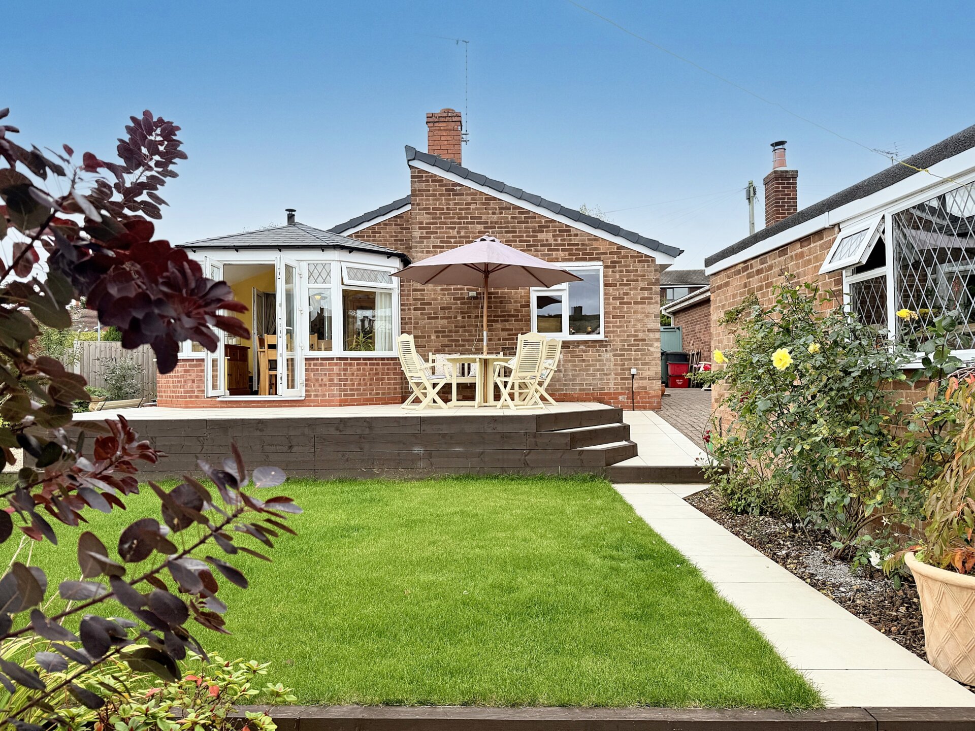 Externally, the property boasts a large corner plot with attractively landscaped gardens to the front, side and rear. The sunny outdoor space is zoned and beautifully designed, offering three separate entertaining areas, including a raised sun terrace and patio that make the most of the lovely open views beyond Breedon.