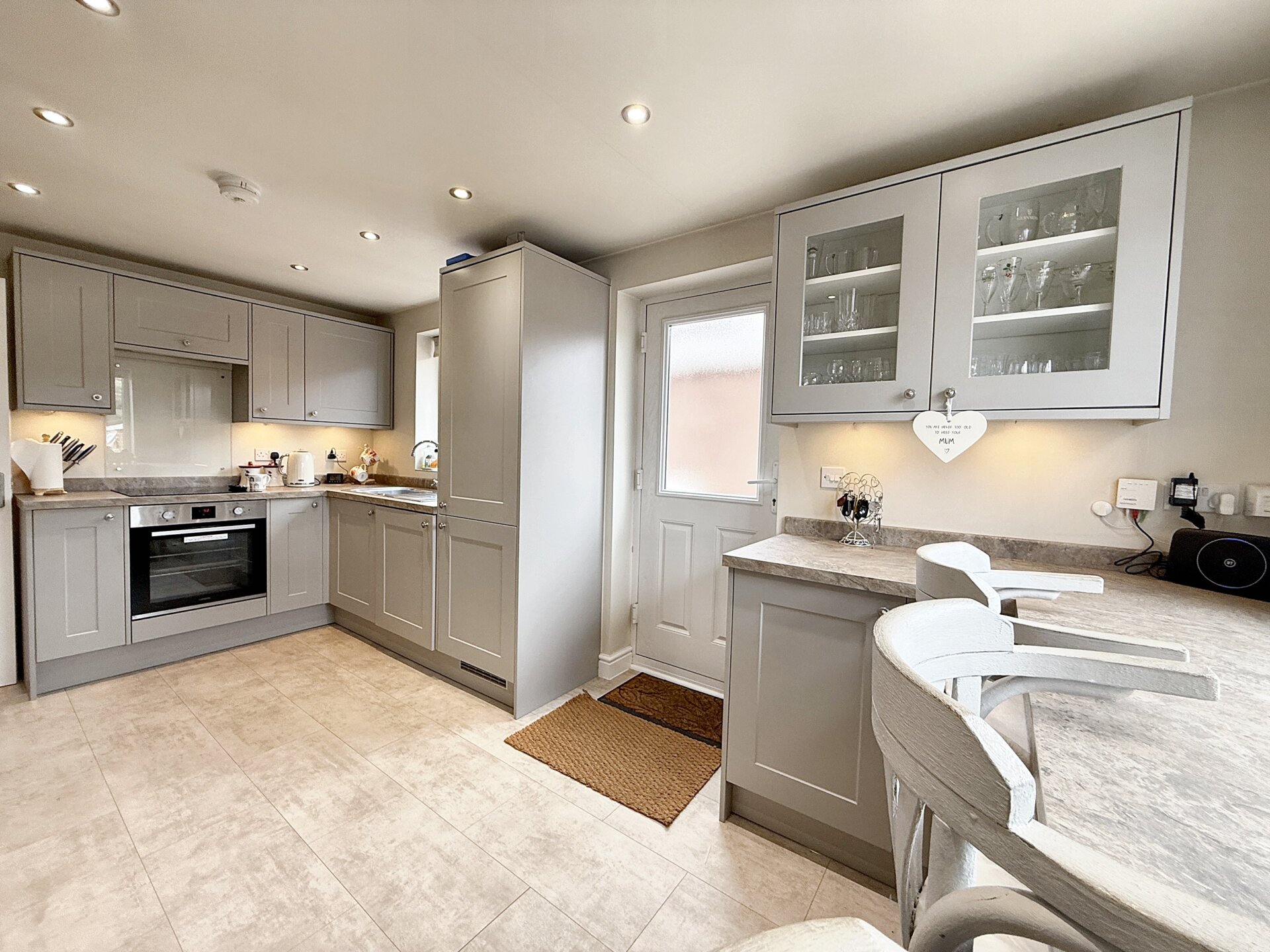 The kitchen features a stunning contemporary shaker-style Howdens design, with a range of eye-level and base units providing ample work surface, storage, and integrated appliance space. Integrated appliances include an induction hob with extractor hood, electric oven, washing machine, and fridge/freezer. A single drainer sink unit with mixer tap and breakfast bar enhance practicality. A cupboard houses the Heatrae Sadia central heating controls, while uPVC double-glazed windows to the side and rear, central heating radiator, tiled flooring, downlighters, and a modern composite and glazed door to the side driveway complete this stylish, functional space.