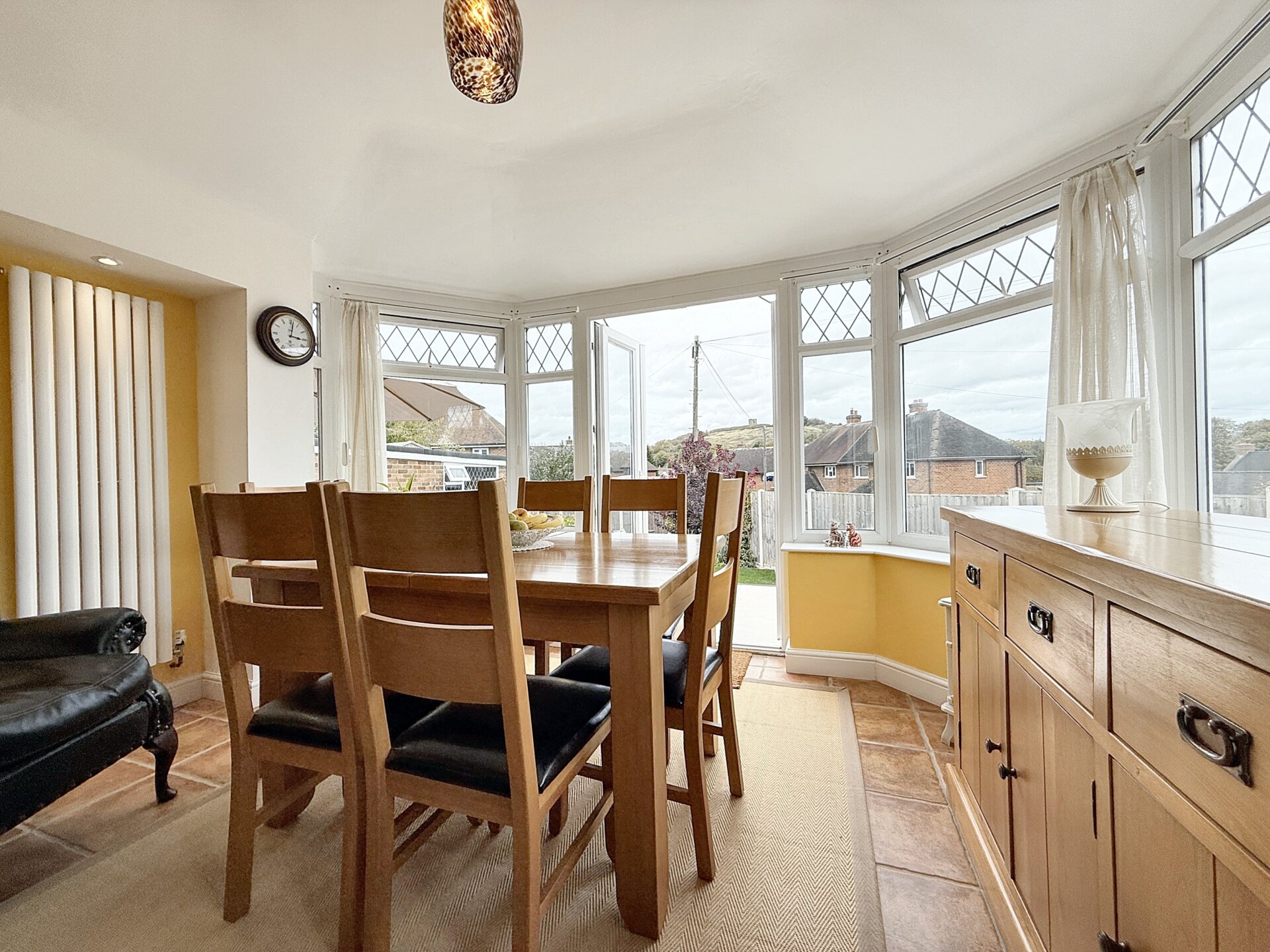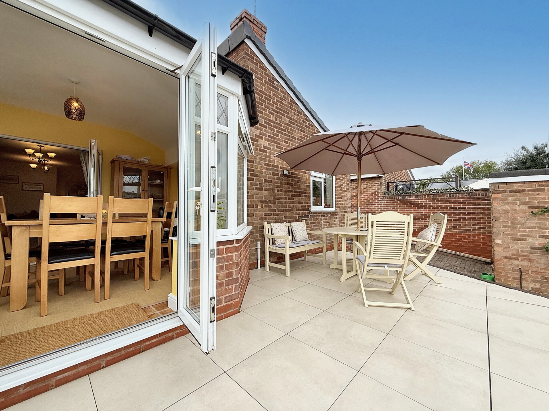 The conservatory is constructed with uPVC double-glazed panels on a brick plinth, combining durability with a bright, airy feel. A contemporary wall-mounted central heating radiator and tiled flooring enhance comfort and practicality. uPVC French doors open onto the adjacent sun terrace, offering pleasant views towards Breedon Priory Church.