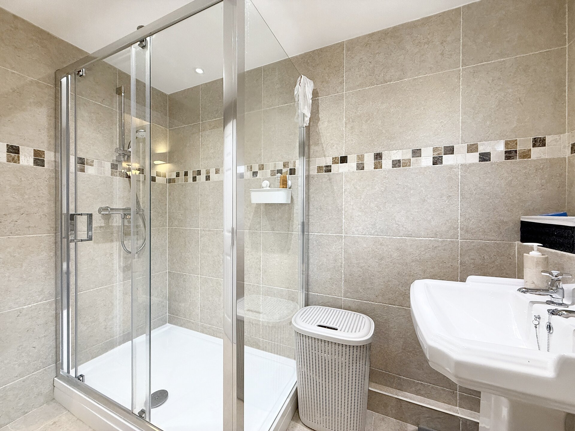 The bathroom comprises a contemporary suite in white, including a wash hand basin and WC. A double walk-in corner shower cubicle houses a chrome thermostatic shower, while an opaque uPVC double-glazed window to the side provides natural light and privacy. The room is finished with a heated towel rail/radiator, tiled walls and flooring, and recessed downlighters for a modern, stylish finish.