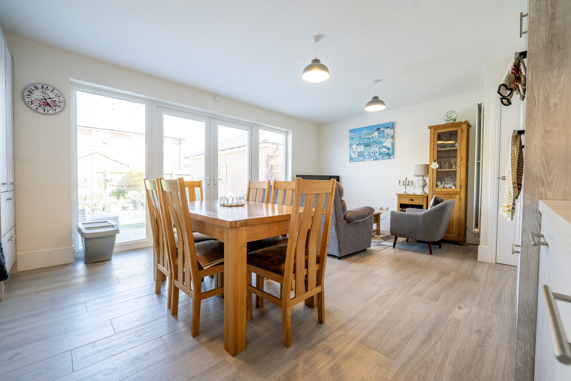 Wall, base and drawer units with work surface over, stainless steel sink/waste/drainer unit with swan mixer tap over, splashbacks, built-in fridge/freezer, built-in eye level oven and separate grill, electric hob and extractor hood over, UPVC Porcelanosa plank tiled floor, TV point, vertical modern radiator, UPVC French doors and windows to the rear garden, door to a large storage cupboard housing plumbing for the washing machine.